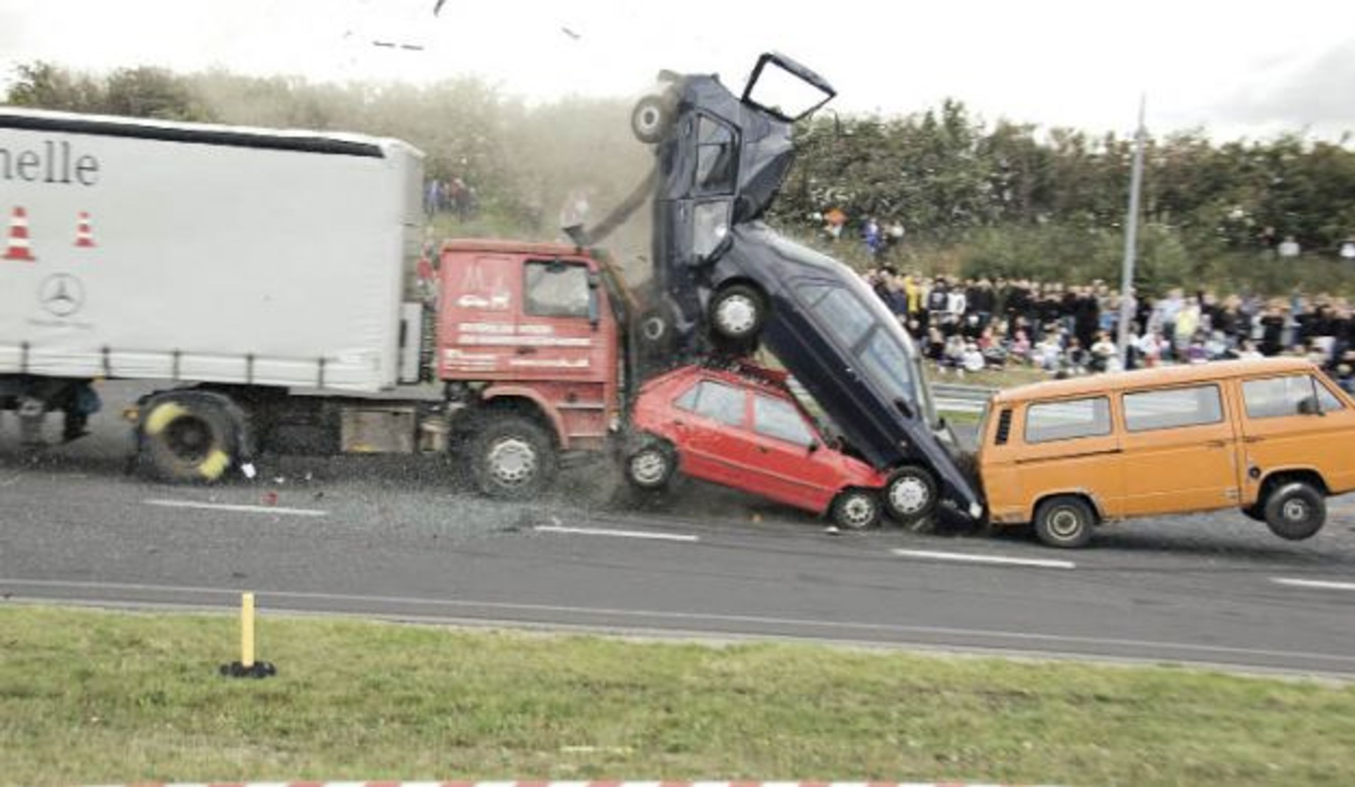 Søndag den 12. september kl. 09.30-16.00 kan du opleve Danmarks vildeste crashtest, når en tonstung lastbil brager ind i en række holdende biler med 70 km/t.