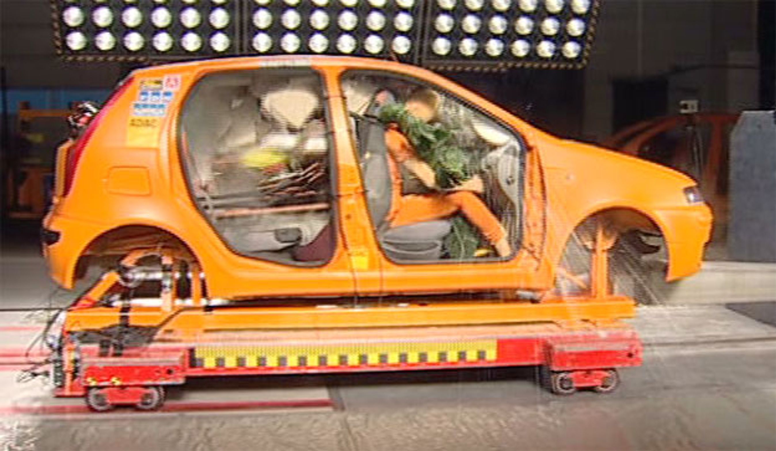 Hvor galt det kan gå, viser en ny crashtest, som FDM har lavet i samarbejde med en række europæiske bilklubber. Her udsættes en Fiat Punto fra 2003 for en nedbremsning svarende til, at man kører ind i en anden bil med 50 km/t. Bilen er lastet med nyindkøbte varer fra et byggemarked, der ved sammenstødet flyver gennem kabinen og rammer de to personer på forsæderne bagfra.