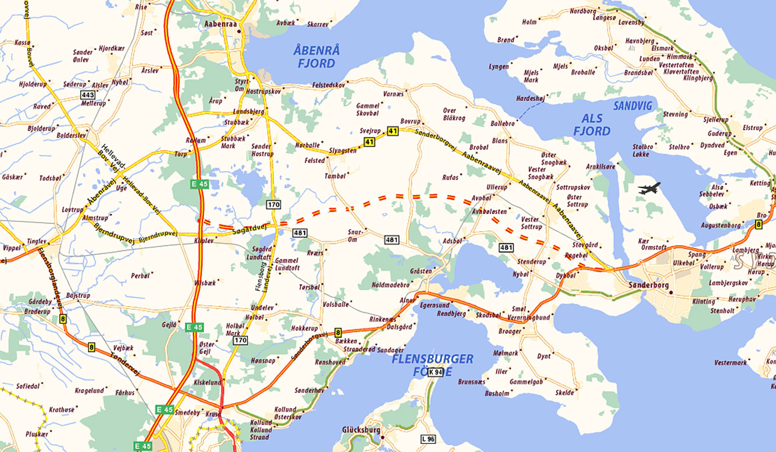 Sønderborgmotorvejen (stiplet) får rutenummer 8, og rute 8 fortsætter fremover mod vest til Tinglev (og som nu til Tønder). Den nuværende 8'er længere mod syd omdøbes til rute 401.