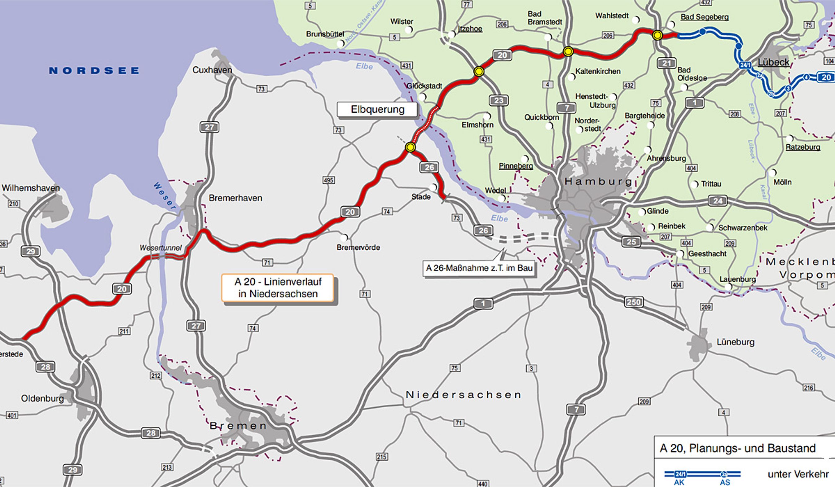 Transportminister Peter Ramsauer og delstaterne Slesvig-Holsten og Niedersachsen har indgået aftale om at anlægge A20 på en 200 km lang strækning fra Lübeck i nordøst, nord om Hamborg og Bremen og ned til Oldenburg nær den hollandske grænse.