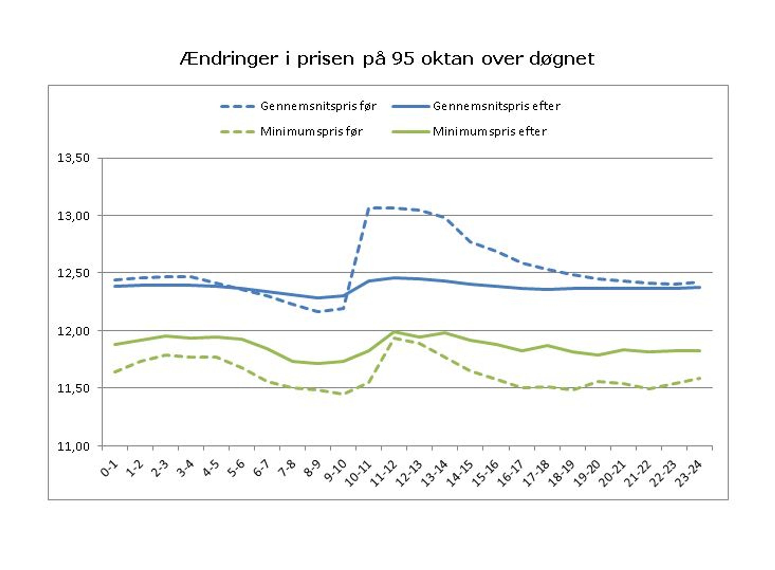 Det er stadig billigst at tanke i timerne før kl. 10 eller sent om aftenen, men forskellene er væsentligt mindre nu. Tidligere var differencen mellem gennemsnitsprisen og minimumsprisen mellem 65 øre og 1,51 kr. pr. liter. I dag er forskellen mellem 44 øre og 61 øre pr. liter.