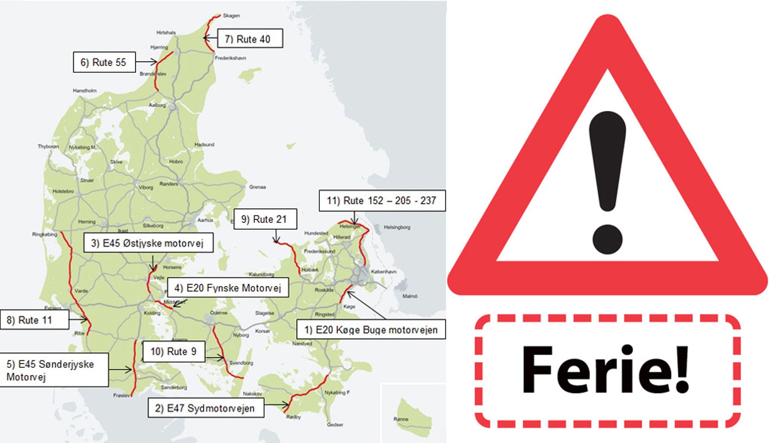 Ferietrafikken i Danmark præges især af megen trafik mod og ved kystområderne samt mellem landsdelene. Det er værst fredag eftermiddag og hele lørdagen.