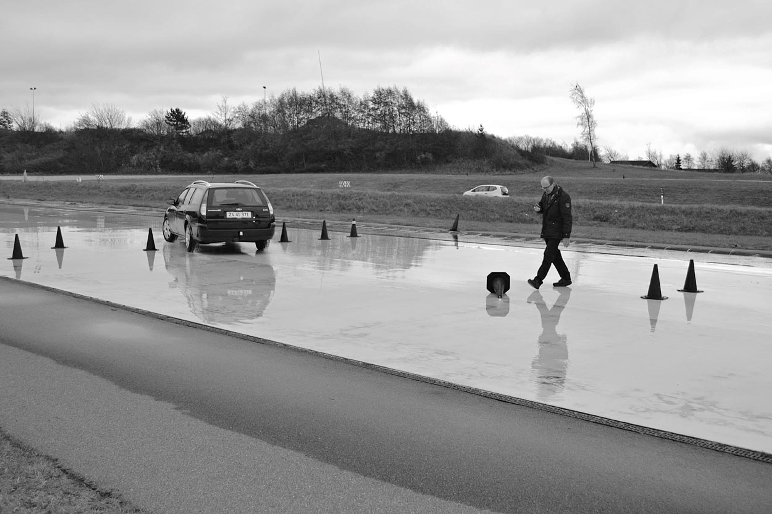Instruktør Kurt Dreisig gør sig umage med at få bilisterne til at træde bremsen i bund, så bilen stopper ved den usynlige linje mellem to kegler. Det er blot en af flere øvelser, de seks kursister skal gennemgå denne eftermiddag på det køretekniske anlæg ved Toksværd nær Næstved. Timerne på anlægget skal give de modne bilister en bedre fornemmelse for deres bilers styrker og begrænsninger i pressede situationer. De har tilmeldt sig et kørekursus via Ældre Sagen, hvor der også indgår en køretime i trafikken og teoriundervisning med en kørelærer.