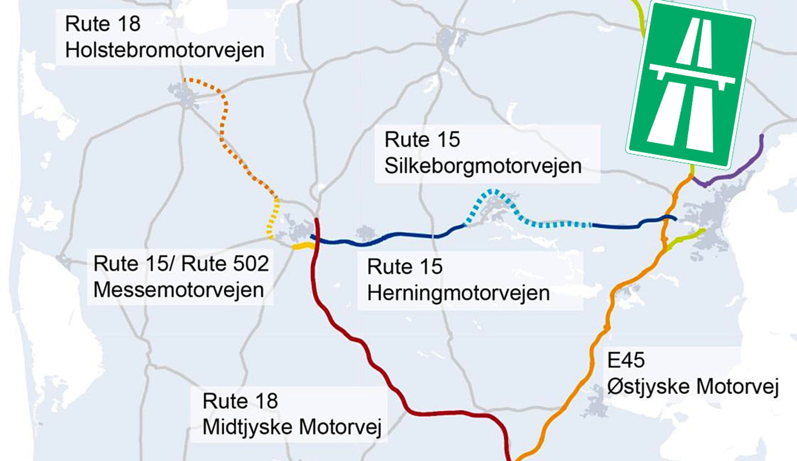 Midtjyske Motorvej Vejle-Herning på rute 18 får altså lov at beholde sit navn. Holstebromotorvejen - den stiplede gule - kommer da heller ikke til at hænge fysisk sammen med Midtjyske Motorvej, idet der bliver en motortrafikvej imellem.