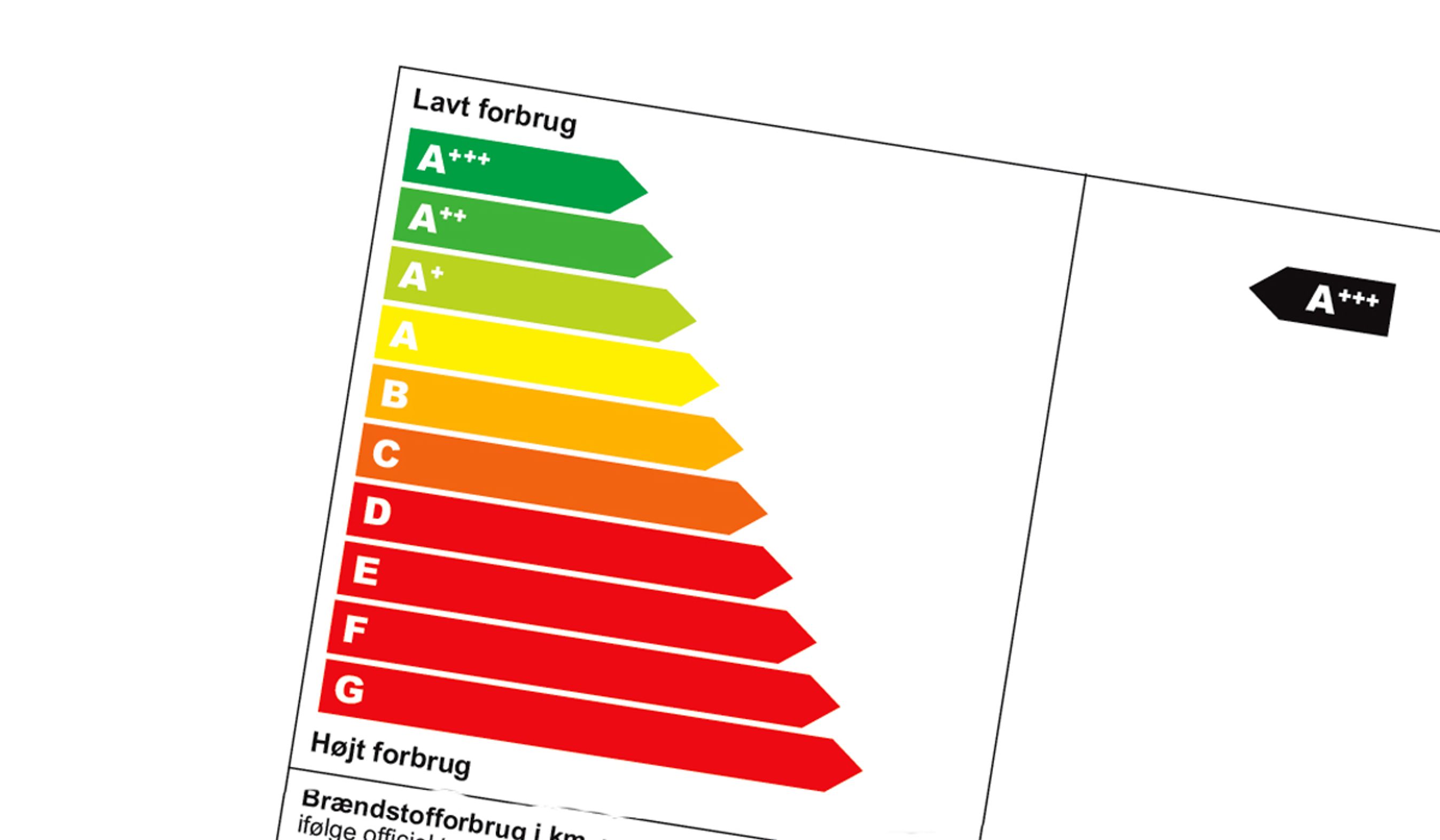 Energiklasse A eller bedre svarer til, at bilernes officielle brændstoføkonomi er 18,2 km pr. liter for benzinbiler og 20,5 km pr. liter for dieselbiler.