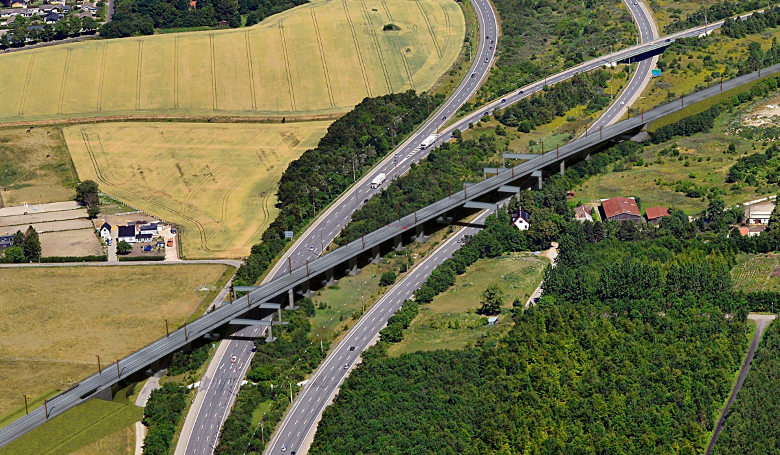Fem steder skal jernbane krydse storkøbenhavnske motorveje med vejarbejde til følge. Arbejdet øst for Ringsted går i gang nu, mens Holbækmotorvejen får fred til efteråret. Illustration: Banedanmark