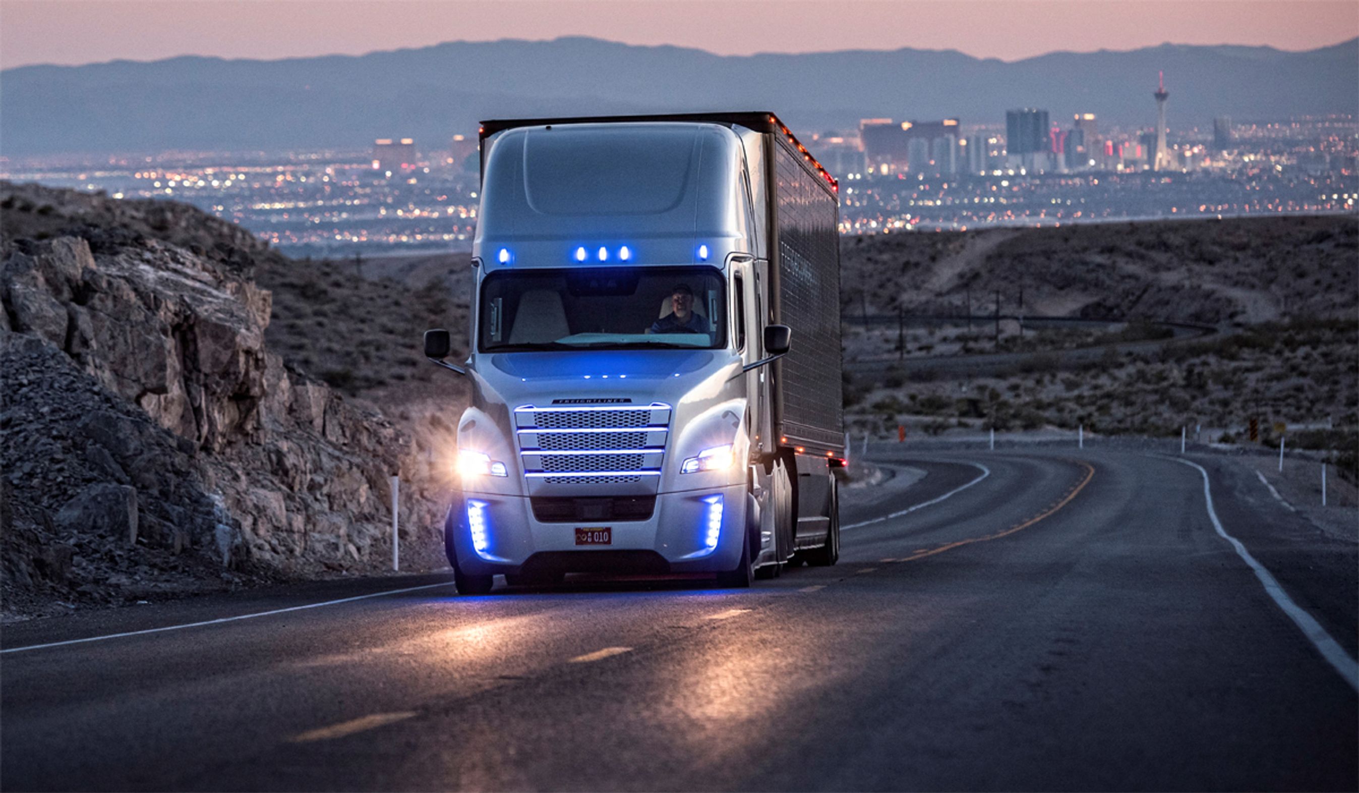 De lastbiler, der nu er i drift i Nevada, er modellen Freightliner Inspiration Truck, som er en serieproduceret Freightliner med den nye Highway Pilot. Et stereokamera og to radarsystemer kombineres med en intelligent fartpilot, der styrer både speeder, styretøj og bremser.