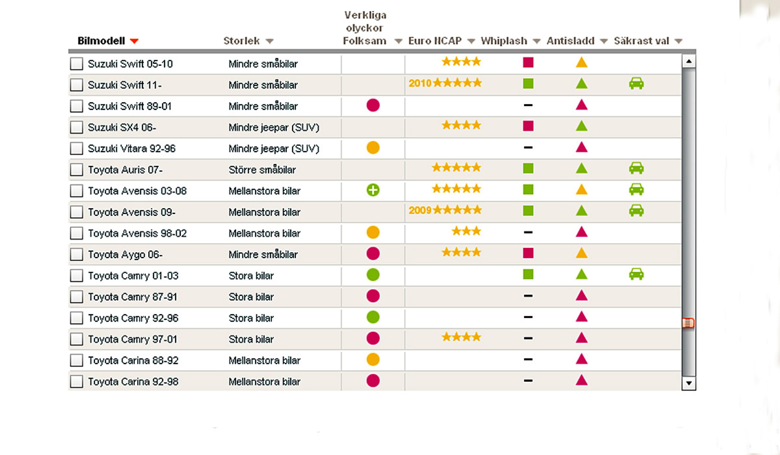 Folksam har på sin hjemmeside en komplet liste over 473 bilmodeller og giver dem karakter. Listen baserer sig ikke kun på selskabets egne undersøgelser, men kombinerer ulykkesanalyserne, Euro NCAP-resultater og vurdering af piskesmældsbeskyttelse og udbredelsen af anti-udskridningssystemet ESC.