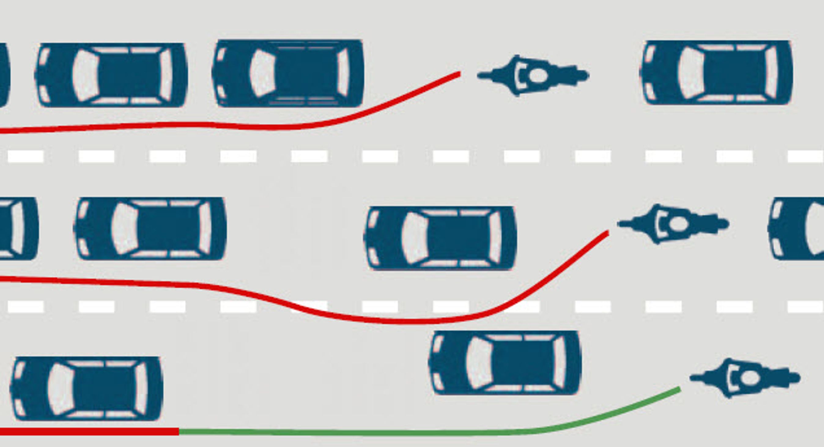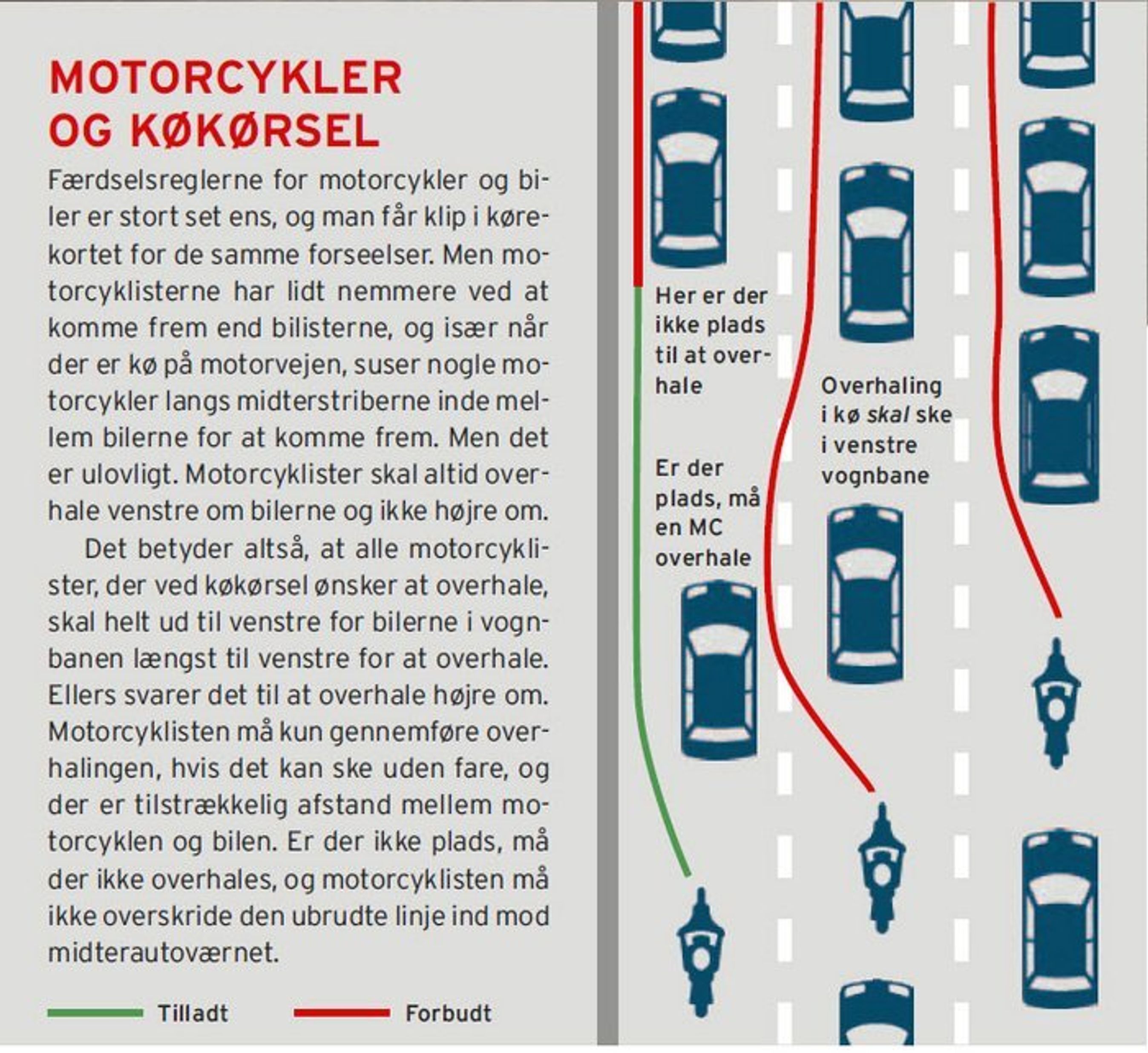 Det er ikke lovligt, når en motorcykel overhaler imellem rækkerne af køretøjer. Heller ikke selv om der synes, at være plads til det.