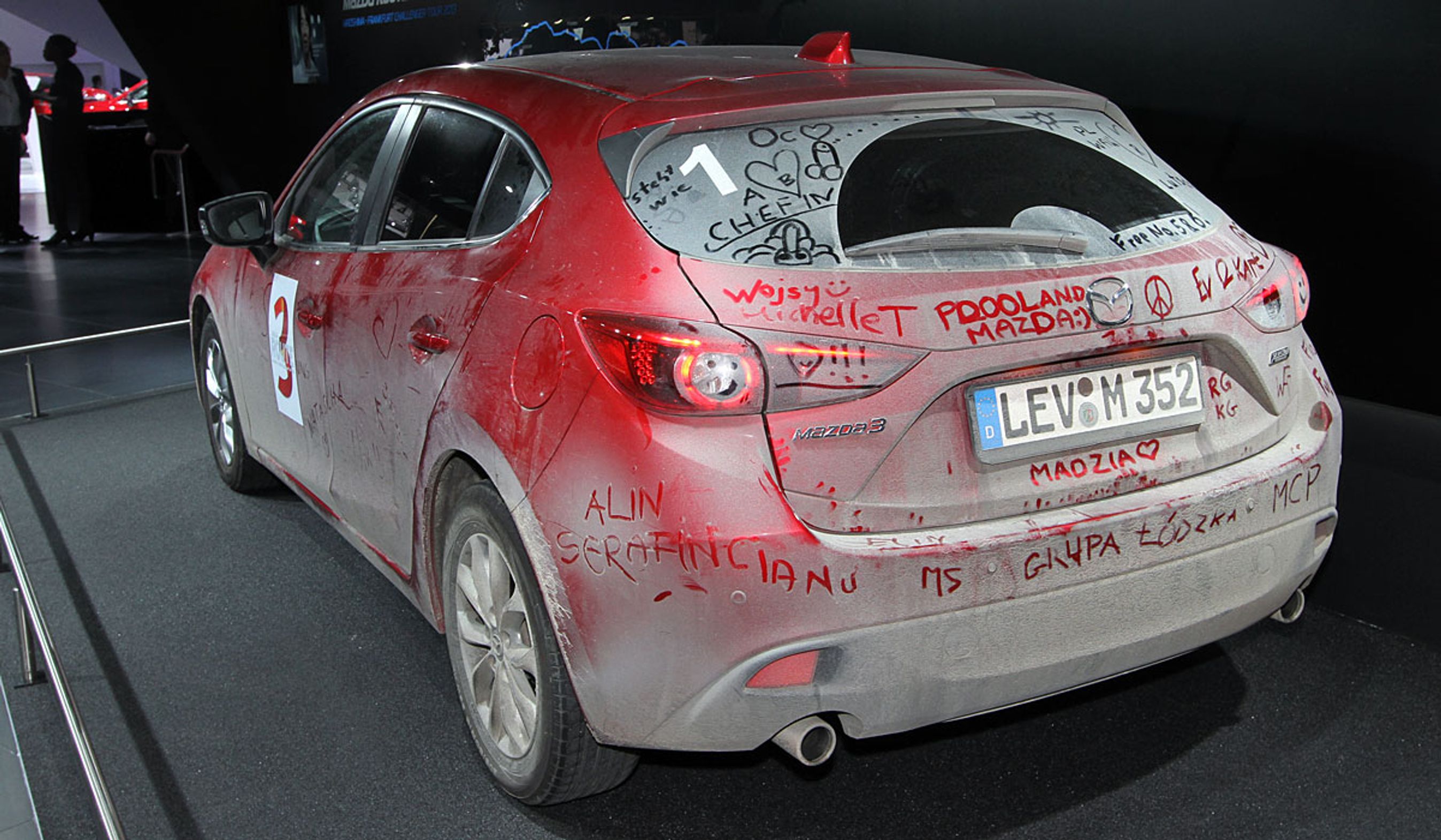 Men ikke Mazda 3 ved verdenspremieren i Frankfurt. Et af de mange udstillede eksemplarer stod lidt bagved og var møgbeskidt.