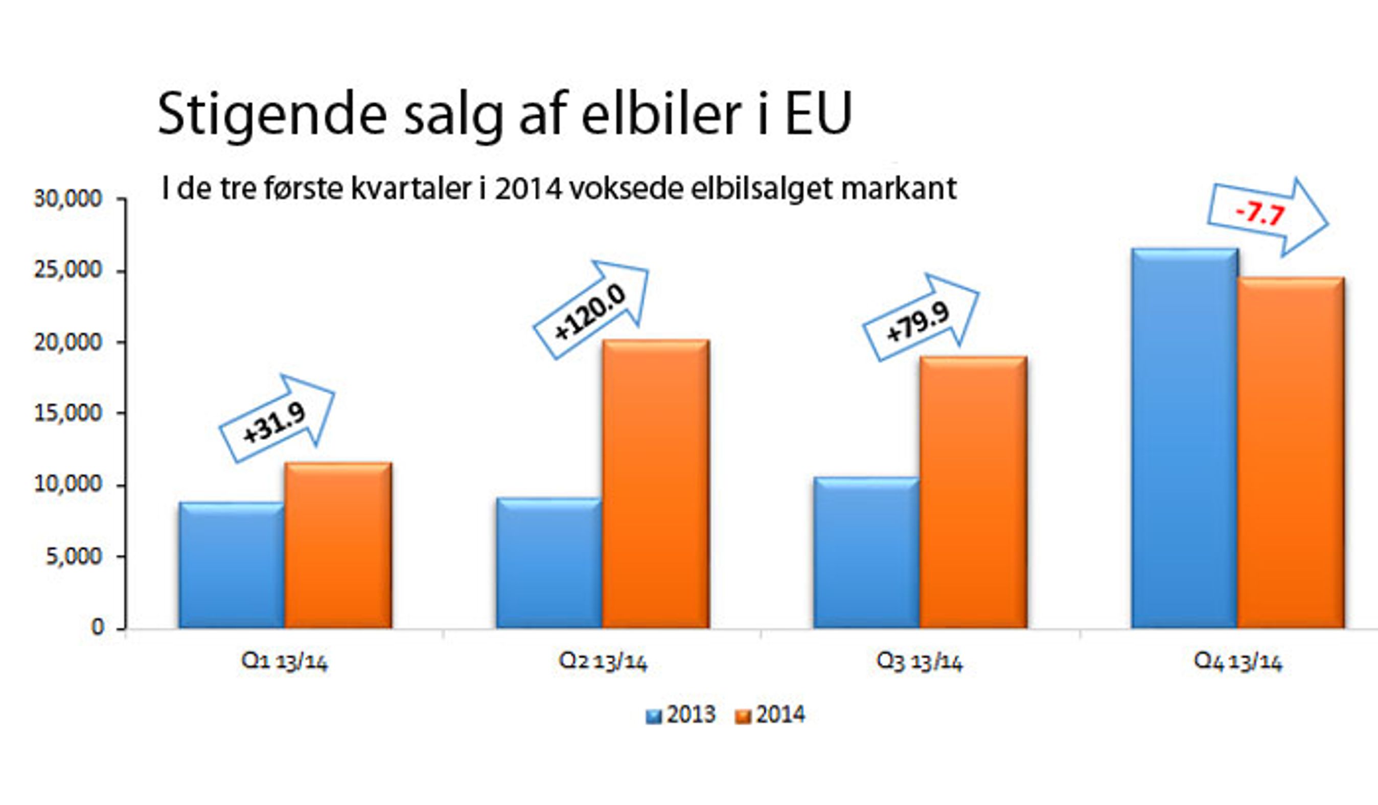 Næsten 100.000 eldrevne personbiler kom på gaden i 2014 i Den Europæiske Union samt EFTA-landende. Det er godt nok kun otte promille af det samlede bilsalg, men dog en stigning på markante 50 procent på et år, viser tal fra den europæiske bilproducentsammenslutning, ACEA.