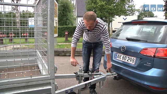 Har din trailer sikkerhedskæde eller kabel, starter du med at sætte det fast i sikkerhedsøjet ved anhængertrækket. Det er vigtigt, at det ikke bare hænger rundt om trækket, for så kan du risikere, at kablet falder af, hvis traileren hopper af anhængertrækket, og dermed mister sin sikkerhedsmæssige funktion.