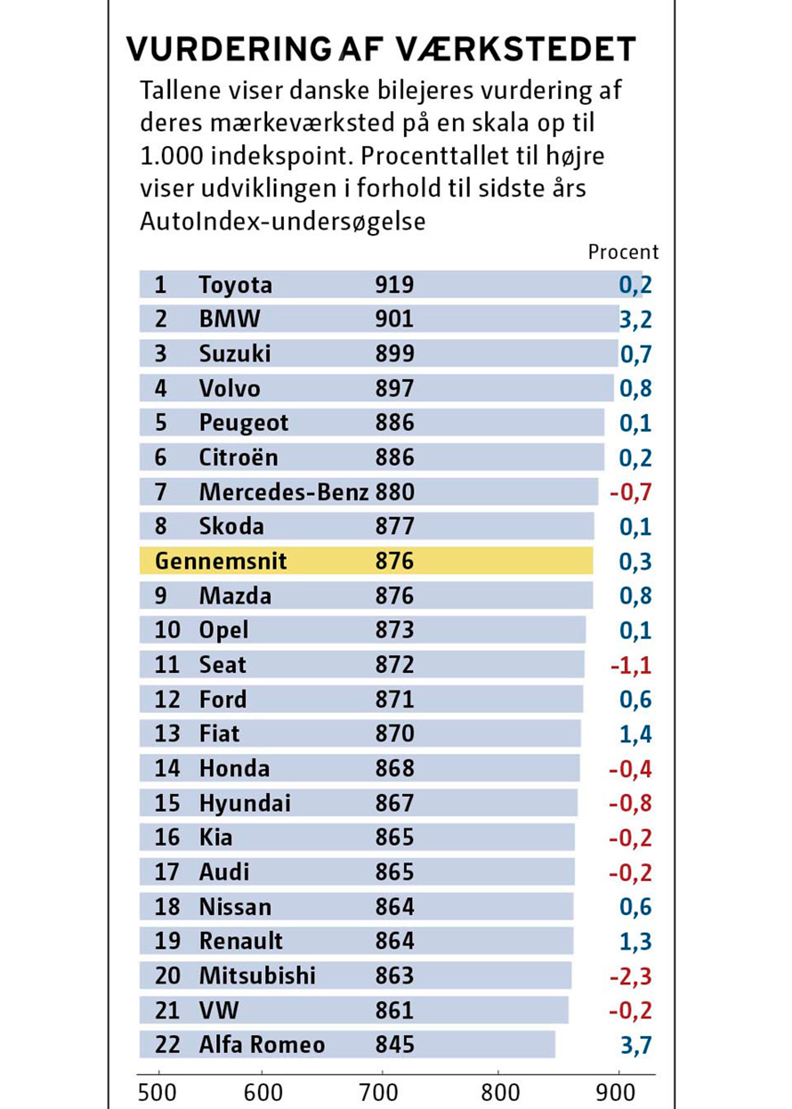 Største fremskridt er dog Alfa Romeo med en stigning på 3,7 procent. Det hjælper dog ikke i den samlede stilling, hvor mærket stadig er sidst blandt alle. Sidste år var der 38 indekspoint op til næstsidste, mens der i år ”kun” er 16 point op til VW, der er næstsidst.