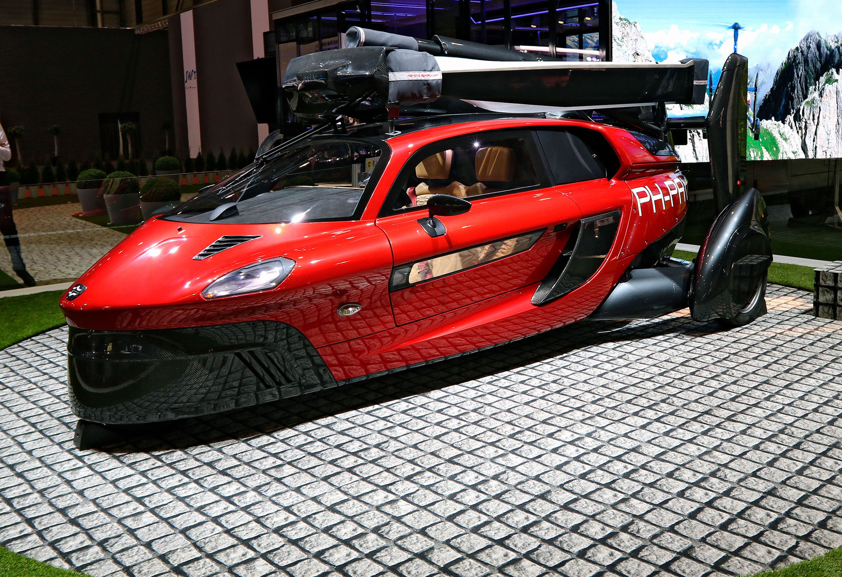 Hollandske PAL-V, som har en stor stand på udstillingen, siger, at det er klar med verdens første flyvende bil, kaldet Liberty. En prototype har fløjet flere gange.