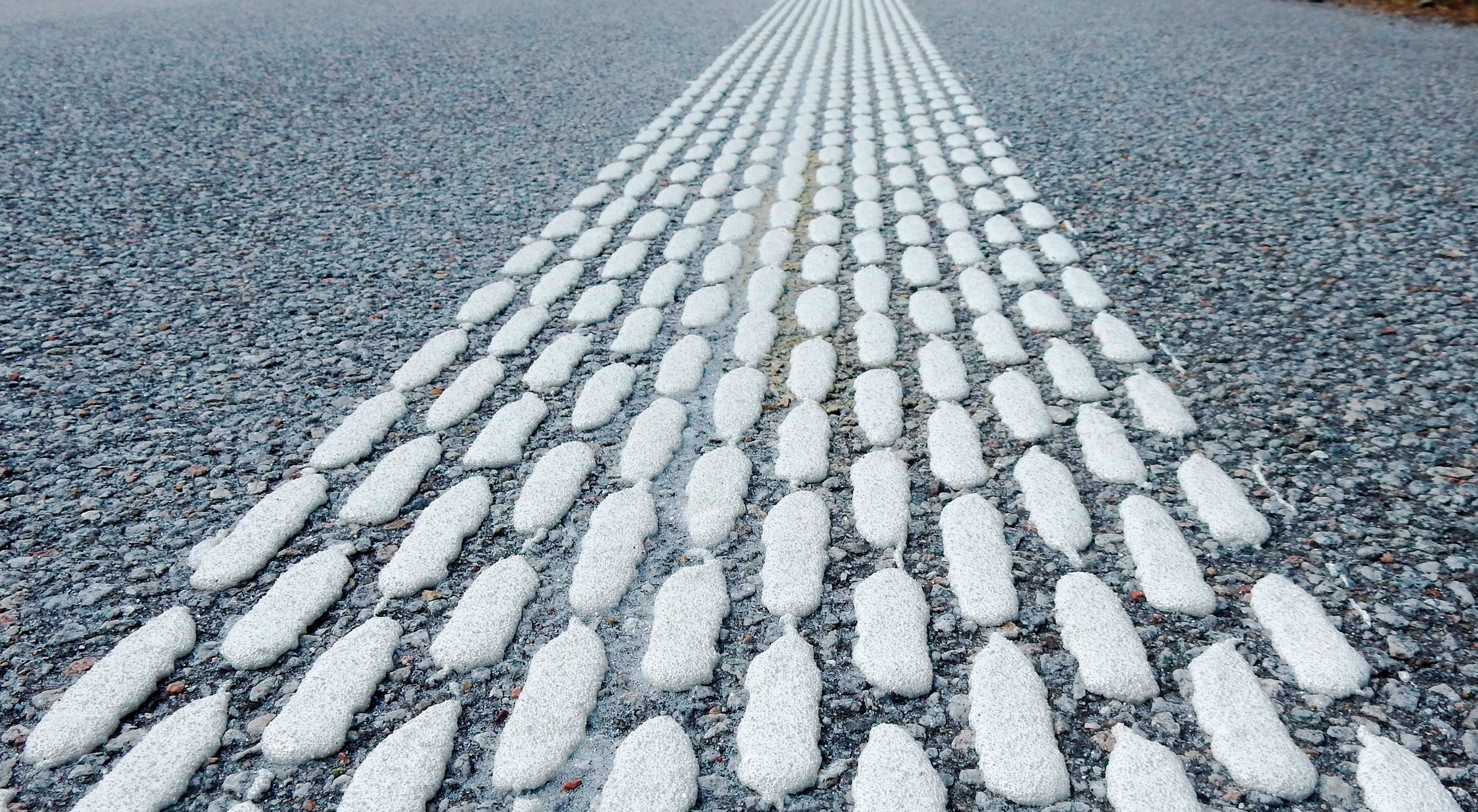 De nye 'Longdot'-striber er aflange prikker, som ligger i forbandt, dvs. forskudt. Derved undgås, at dækkene rammer kanterne er prikkerne. Fotos: Jesper Galsgaard
