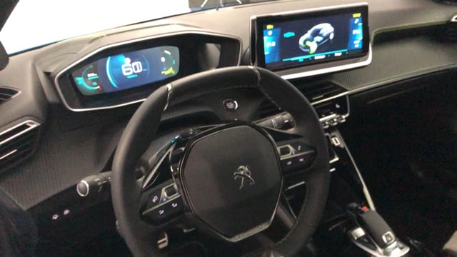 Førerpladsen er kendetegnet ved det lille rat og det digitale instrumentbord, der skal se hen over rattet. Gearstangen er af typen ’shift-by-wire’. Det betyder, at den er elektrisk koblet til gearkassen, og at den selv går i ’P’, når man slukker motoren. Foto: Peugeot