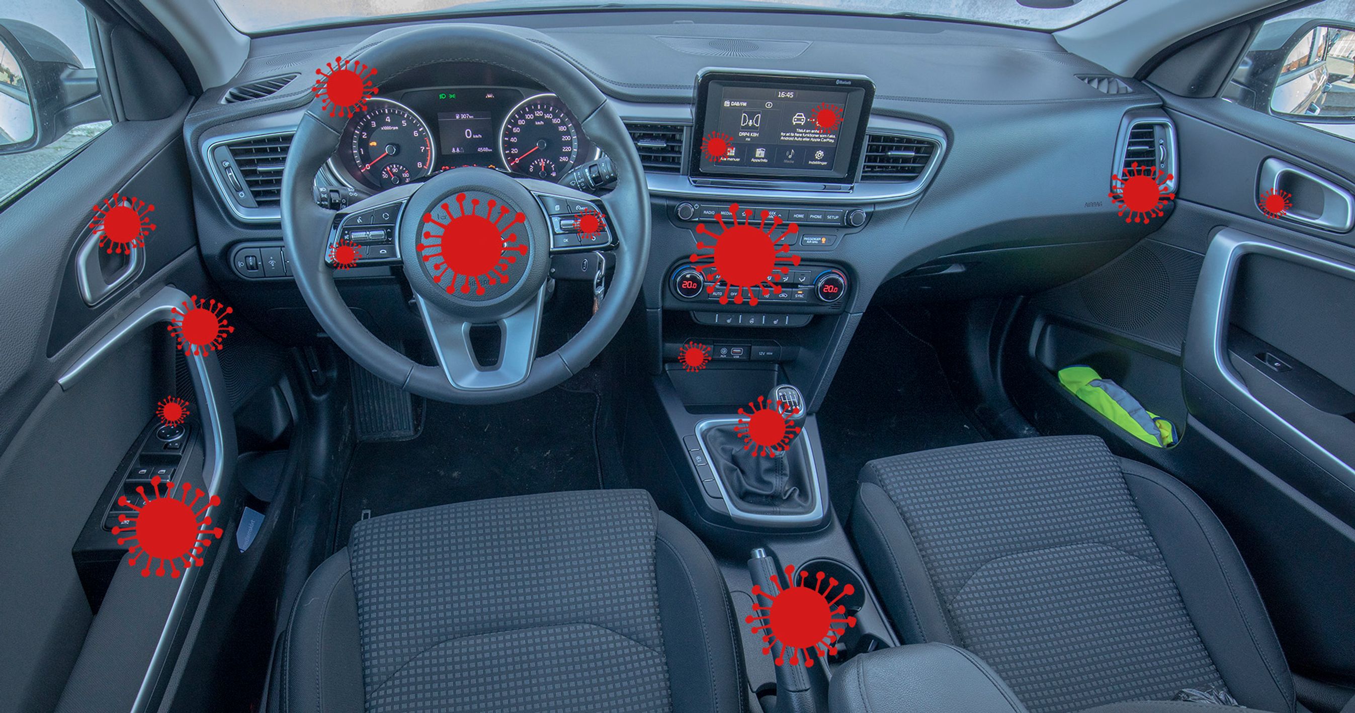 Man tænker ikke over det, men under en køretur er der faktisk mange steder i bilen, du rører med hænderne. Rens alle steder eller brug engangshandsker i en lånebil.