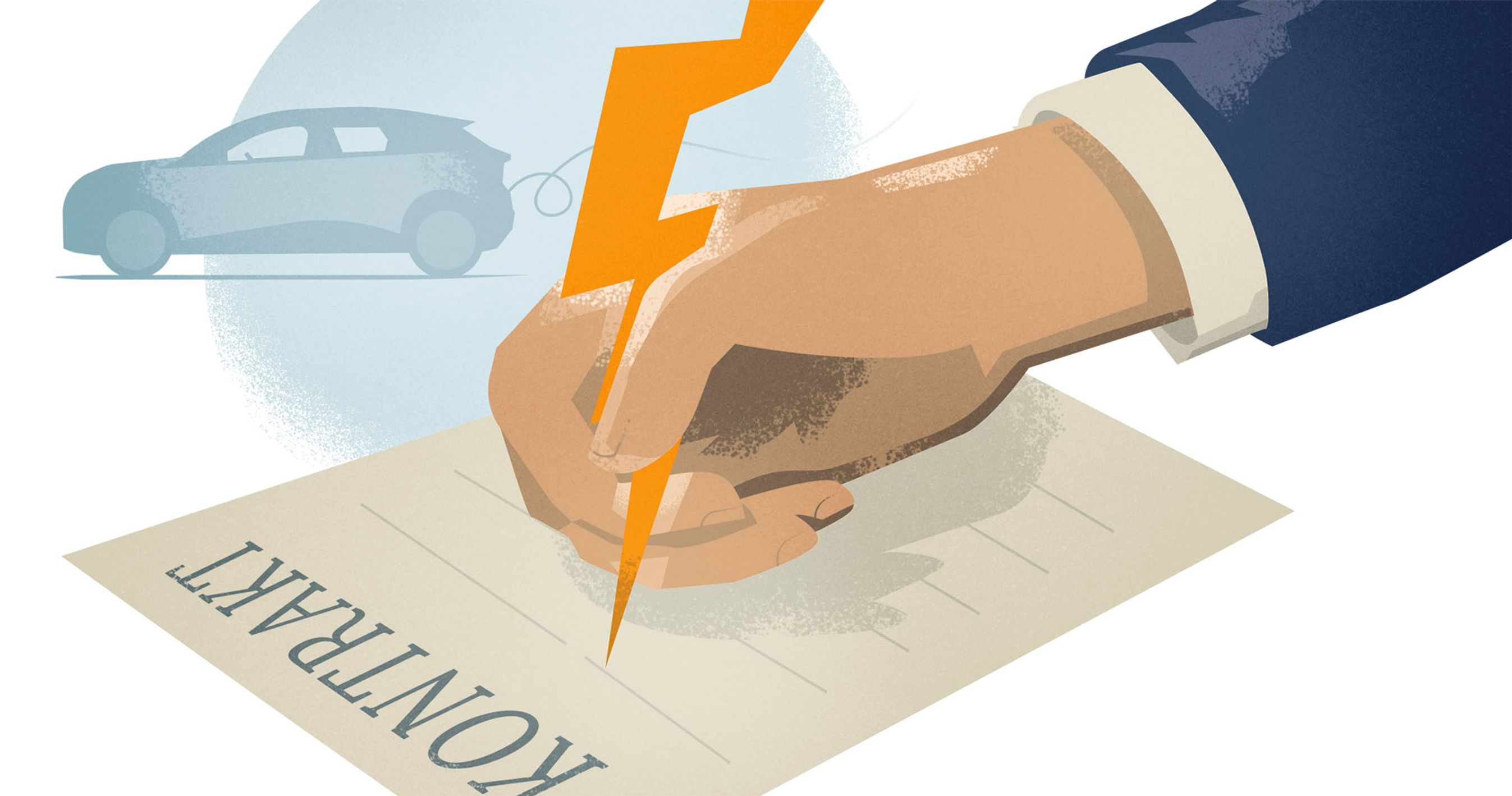 Kontrakt underskrives med lyn. Elbil i baggrunden.