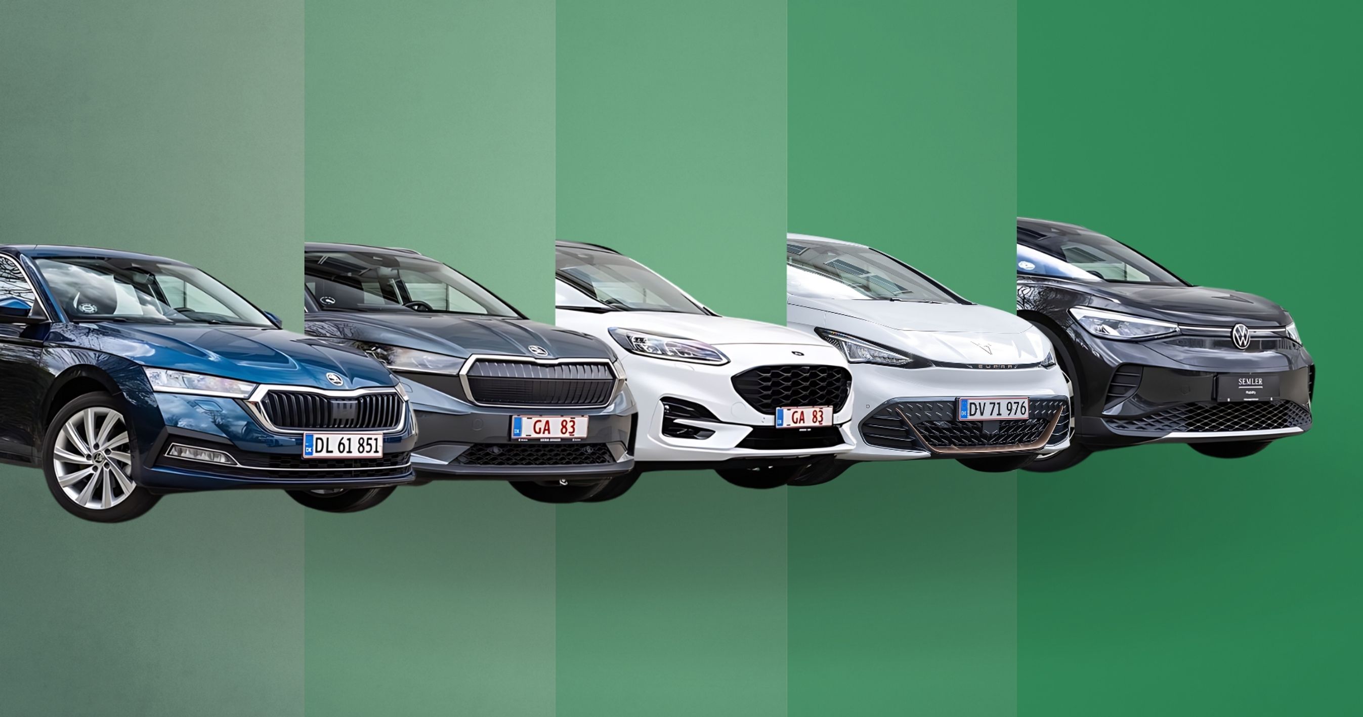 Tre af bilerne er teknisk set nærmest identiske: Cupra Born, Skoda Enyaq og VW ID.4 er alle bygget på VW-koncernens elbilplatform. De sidste to kandidater, Ford Kuga og Skoda Octavia, fås ikke som elbiler, men findes i en opladelig version som plugin-hybrid. Derudover findes begge modeller også med benzin- og dieselmotorer.
