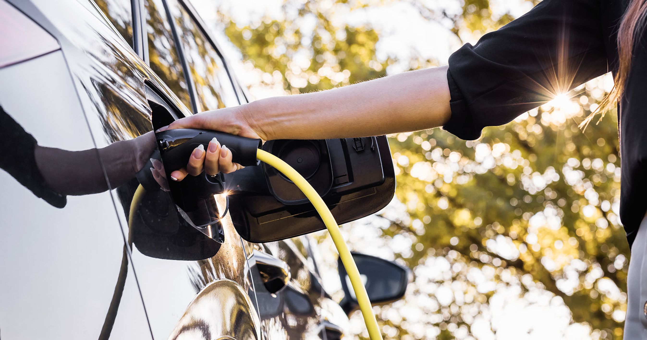 Elbil bliver sat til opladning. Kvinde med sort bluse og hvid kjole.