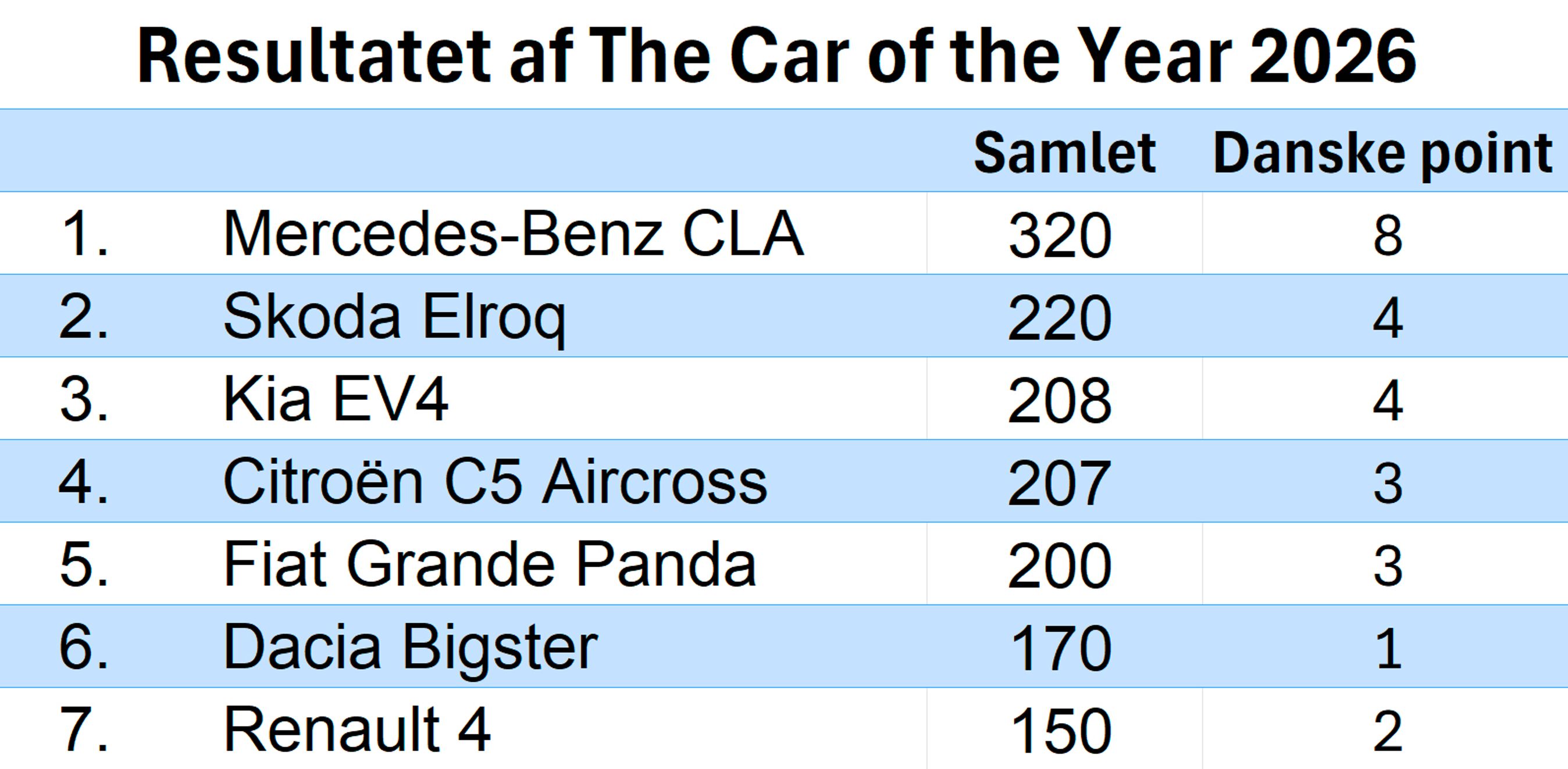 The Car of the Year 2026 er fundet. Sejren gik særdeles sikkert til Mercedes-Benz, der vinder den vigtige titel for første gang i 52 år. Den avancerede CLA får 2026-titlen med god afstand til Skoda Elroq. Se resultatet her.