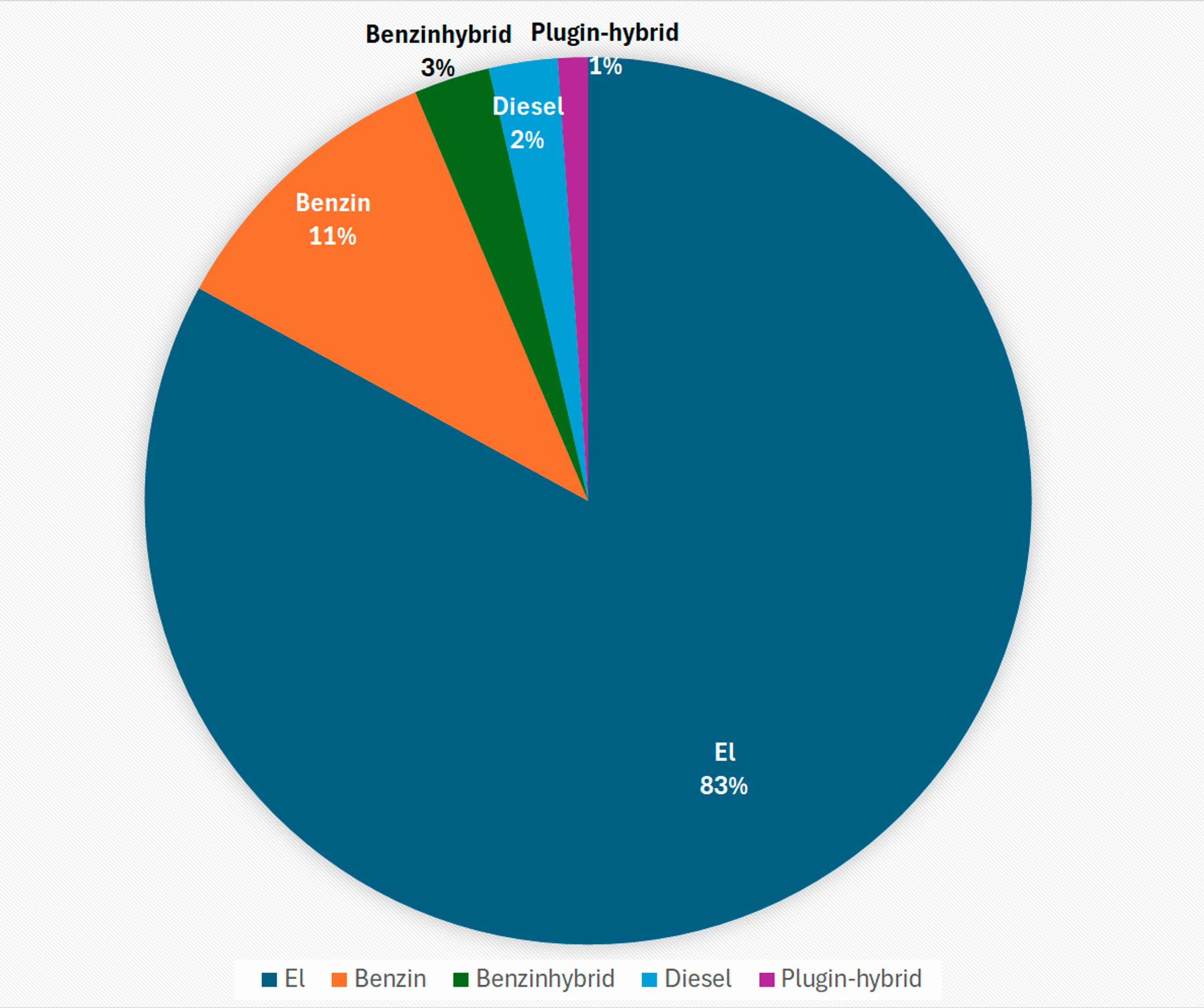 Det store elbilsalg levner ikke meget plads til andre drivmidler. Benzinbiler udgjorde 10,7 pct. og dieselbiler 2,5 pct.
