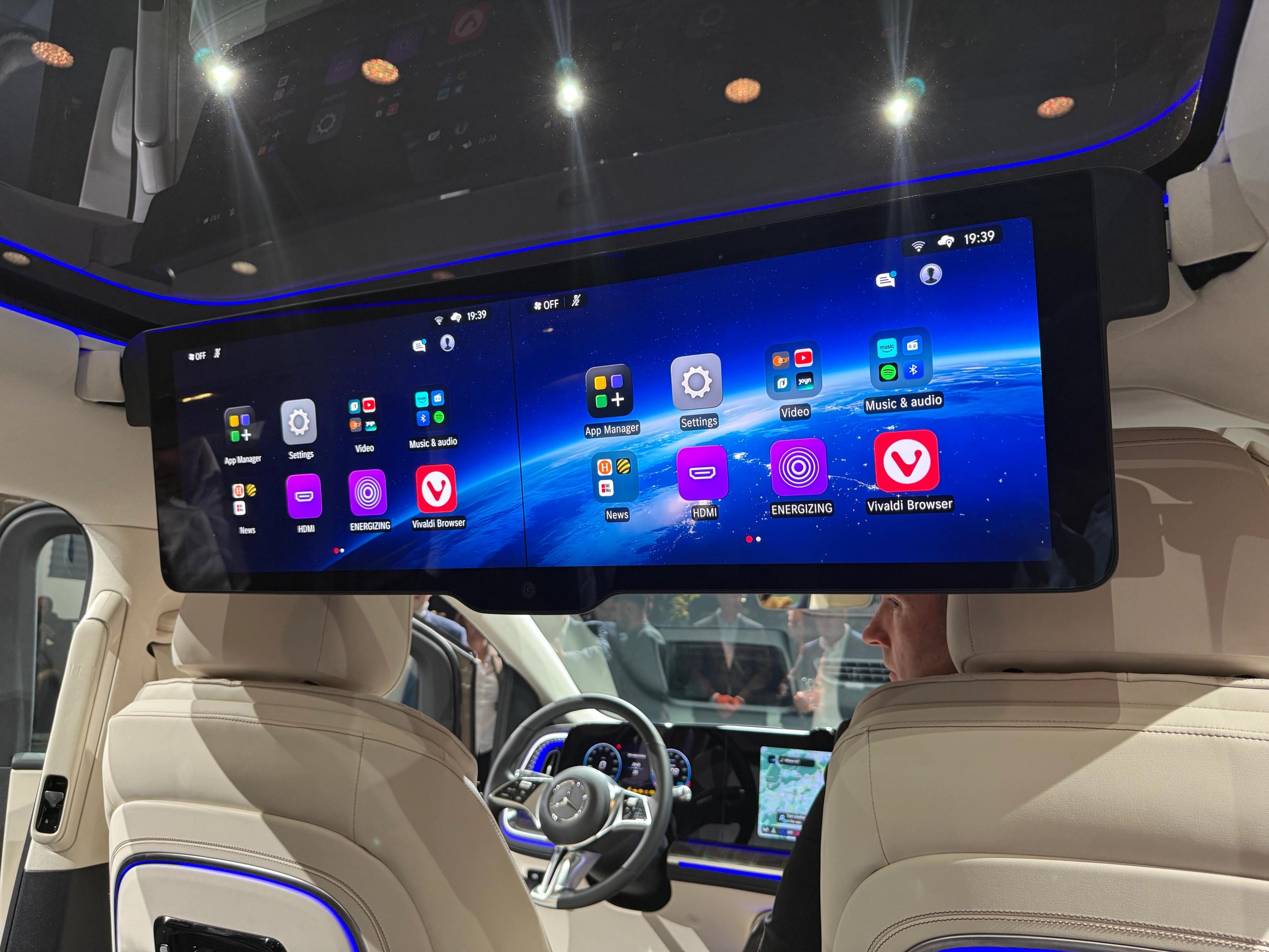 Bagi kan en 32” tv-skærm vippe ud fra loftet og derved forvandle bilen til en rullende hjemmebio.