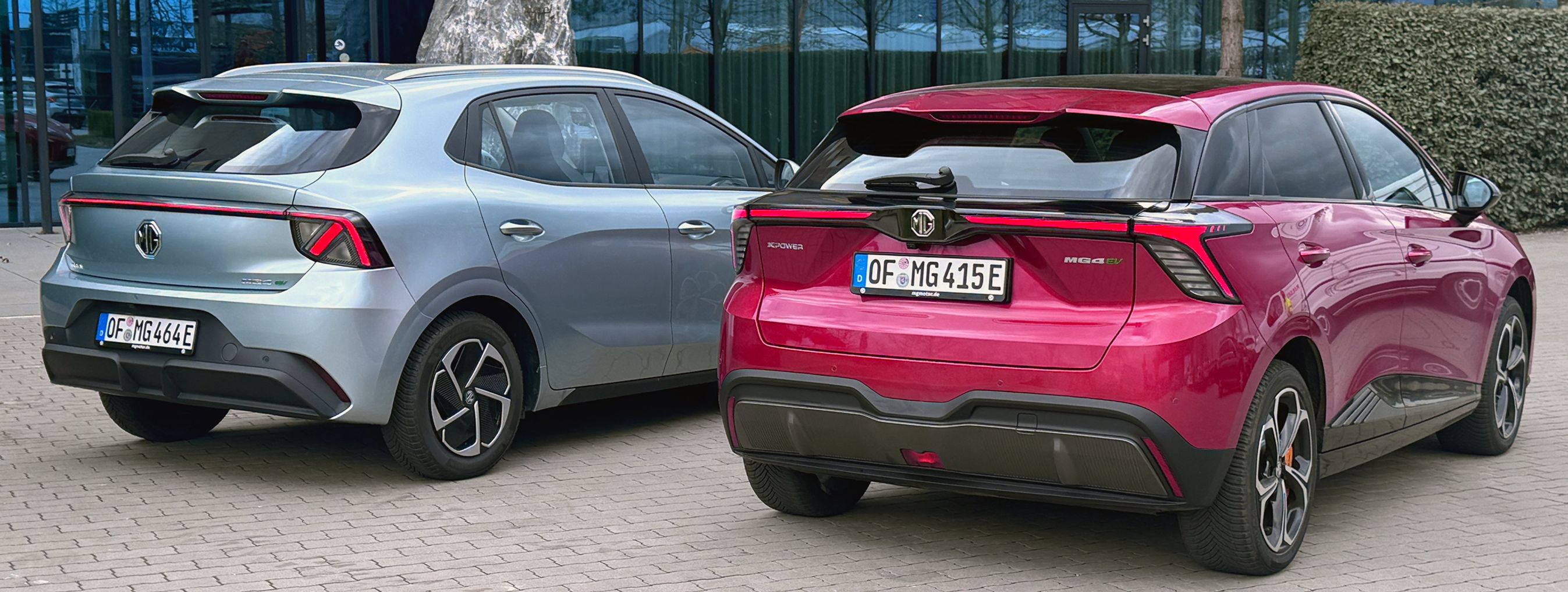 MG 4 Urban (blå) og MG 4 facelift er fuldstændige forskellige at se på. Urban virker lidt slasket i designet. Så hjælper det ikke, at MG fremhæver at pile-baglygterne er inspireret af roadsteren Cyberster.