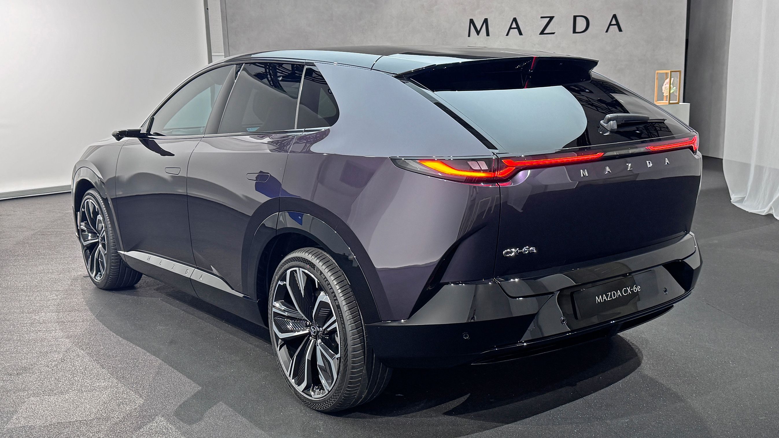 Mazda CX-6e er en markant designet SUV med coupéprofil. Denne violette farve er forbeholdt topudgaven Takumi Plus.