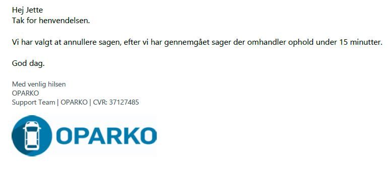 Efter at have afvist Jette Gerdings klage er Oparko kommet på andre tanker og har nu valgt at frafalde deres krav for den parkering, Jette Gerding aldrig foretog.