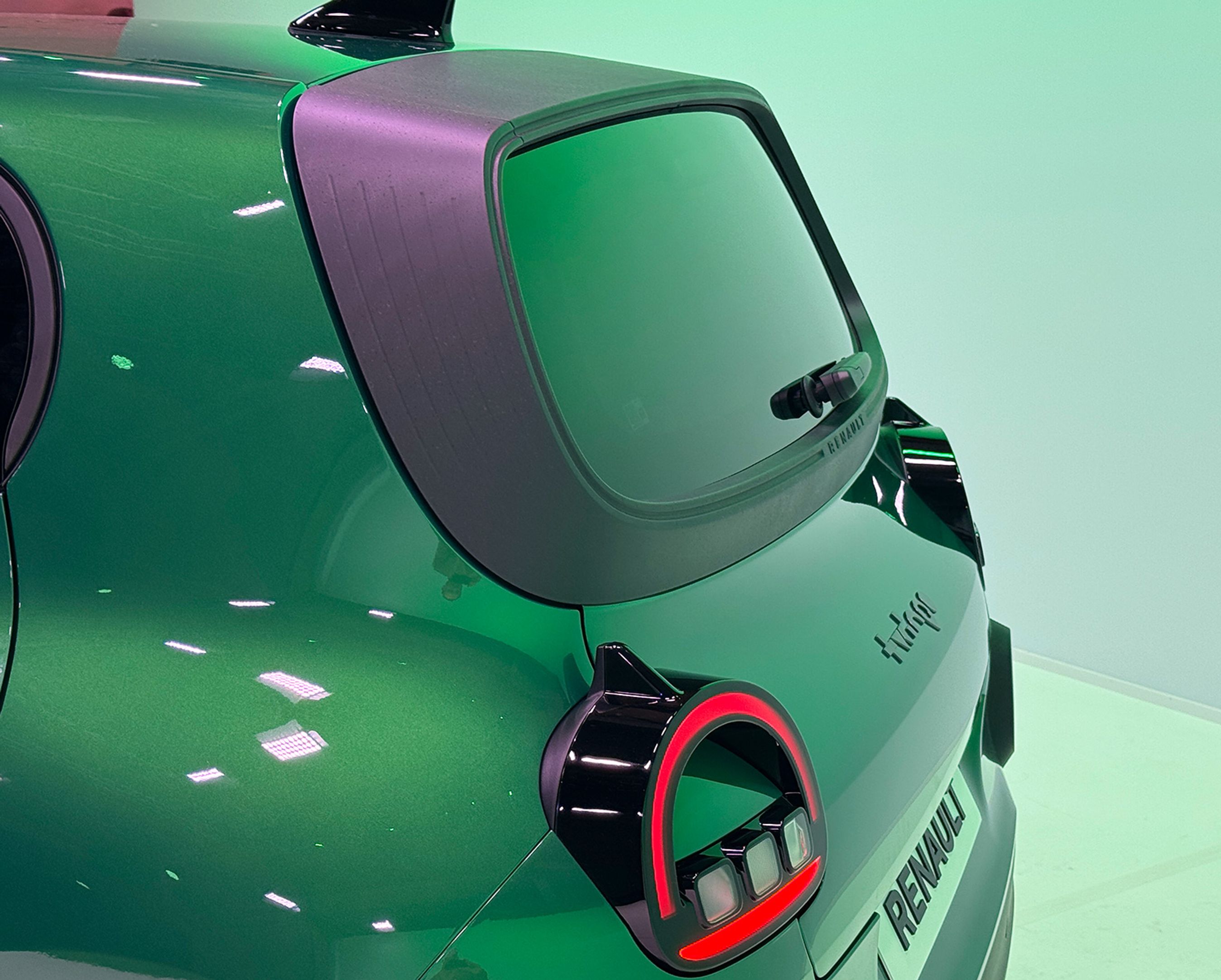 Den store krave rundt om bagruden har ikke noget med den originale Twingo at gøre, men giver bilen karakter og bidrager til god aerodynamik. Den lille dims øverst på baglygten har også en aerodynamisk funktion. Twingo er udstyret med bagrudevisker.