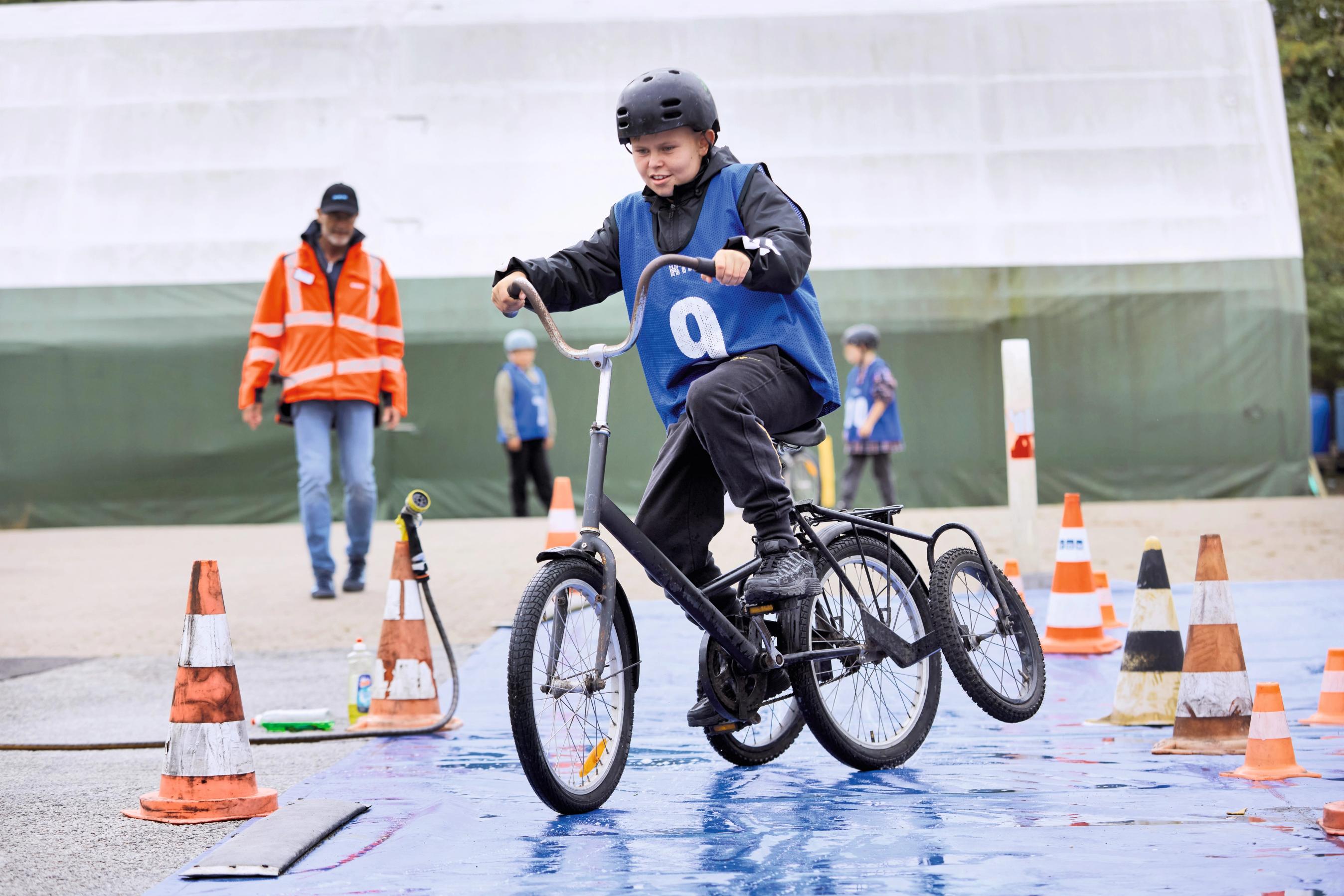 Hjelmen kommer hurtigt på, da en tredjedel af børnene går hen til første øvelse, der er en glatbane for cykler. En presenning er spændt ud på asfalten, og en blanding af vand og opvaskemiddel gør den glat. Her skal de små cyklister først lære at bremse på glat føre og siden undvige kegler.