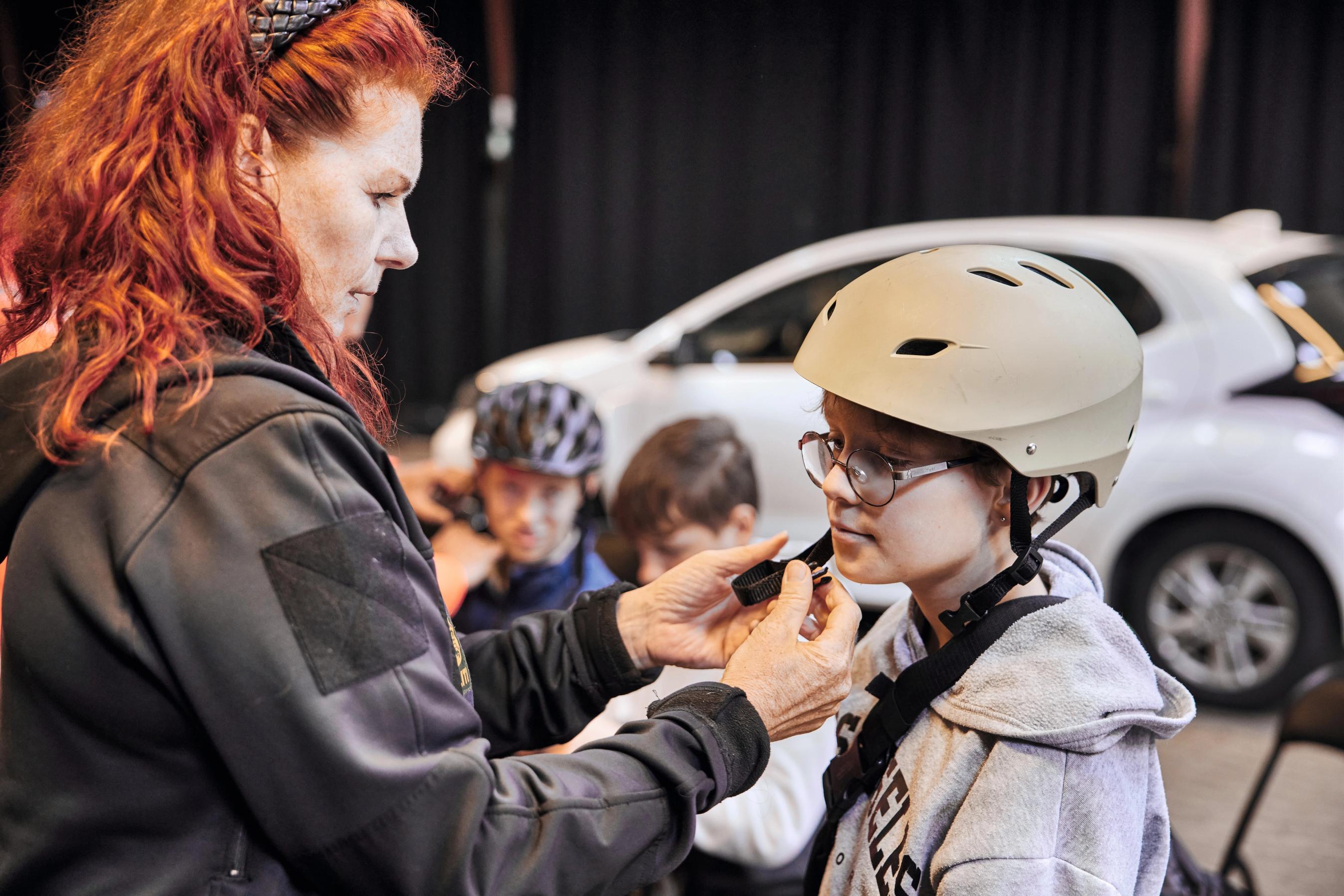 De er i gang med introduktionen til de tre øvelser, de skal igennem, og der bliver talt om både højresvingsulykker, sikkerhedsseler, cykellygter, refleksveste og ikke mindst cykelhjelme, som de alle har med under armen.