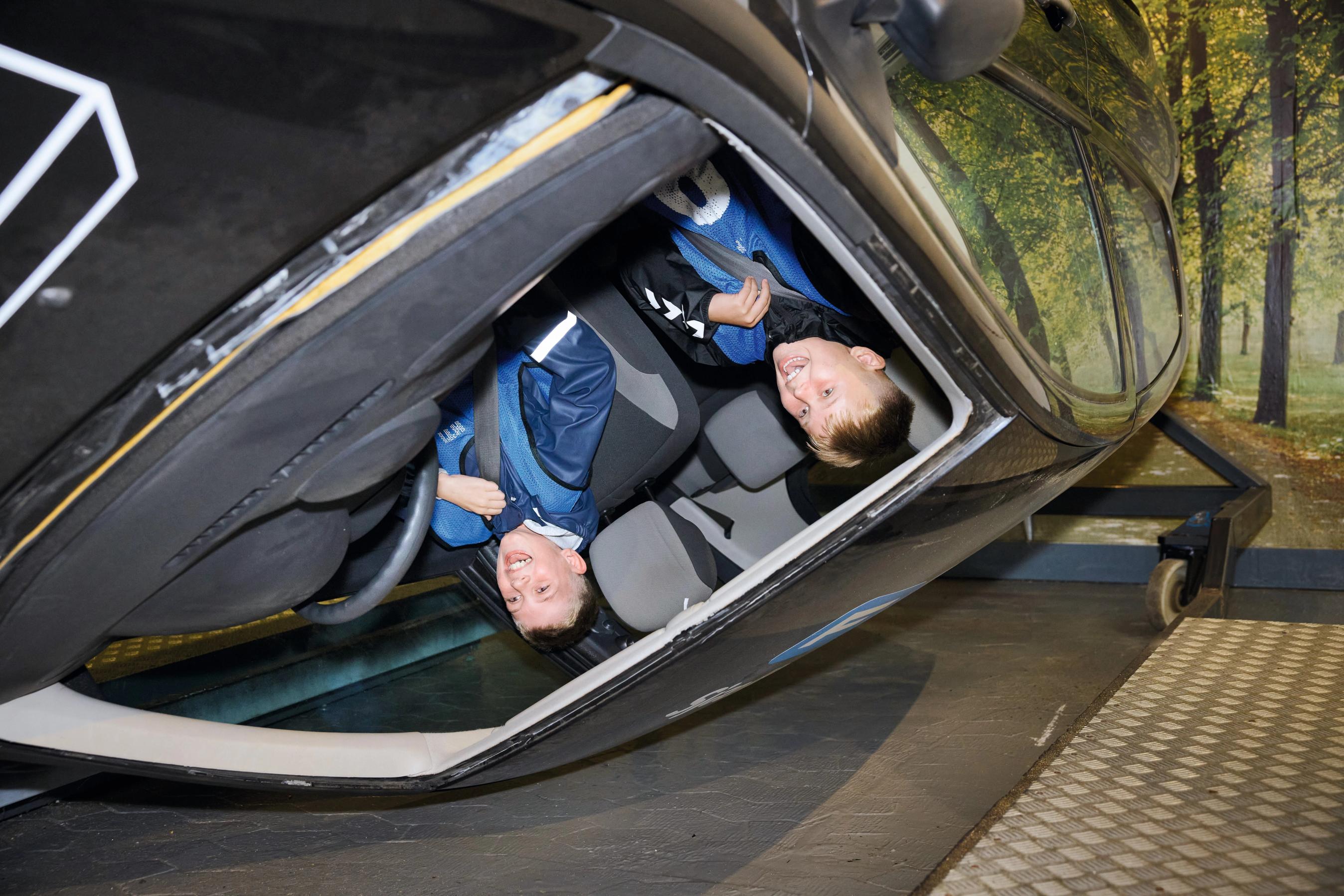 Til sidst får eleverne lov at mærke selens styrke, da de sidder i en væltebil, der på en lift kan drejes om sin egen akse. Stille vippes bilen, indtil ungerne grinende hænger med hovedet nedad, mens selen strammer og holder dem fast. Det skal være sjovt at lære, selvom det er alvor.