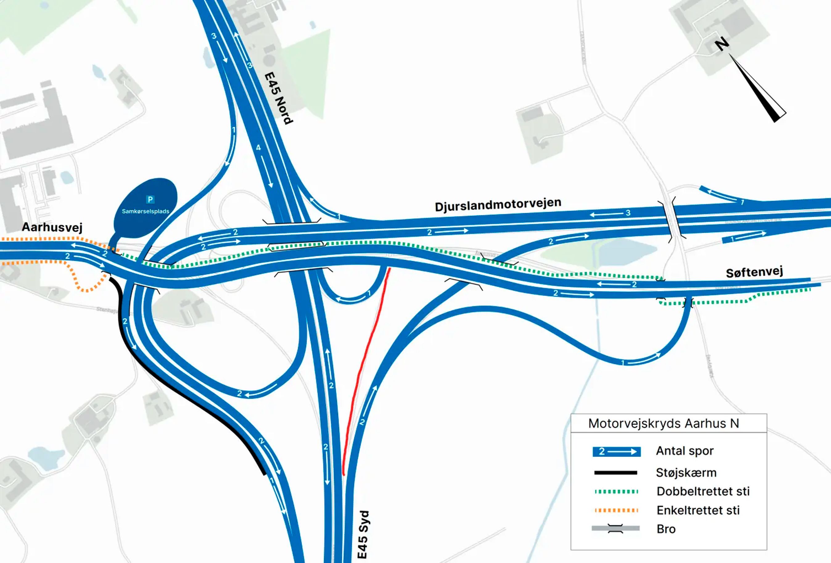 Motorvejskryds Aarhus Nord er kompliceret, men trafikflowet skulle gerne blive bedre med den gigantiske ombygning. Den røde streg er en frakørselsrampe, der netop er nedlagt. Det betyder, at der nu er byttet om på de nye frakørsler til Djursland og Hinnerup.