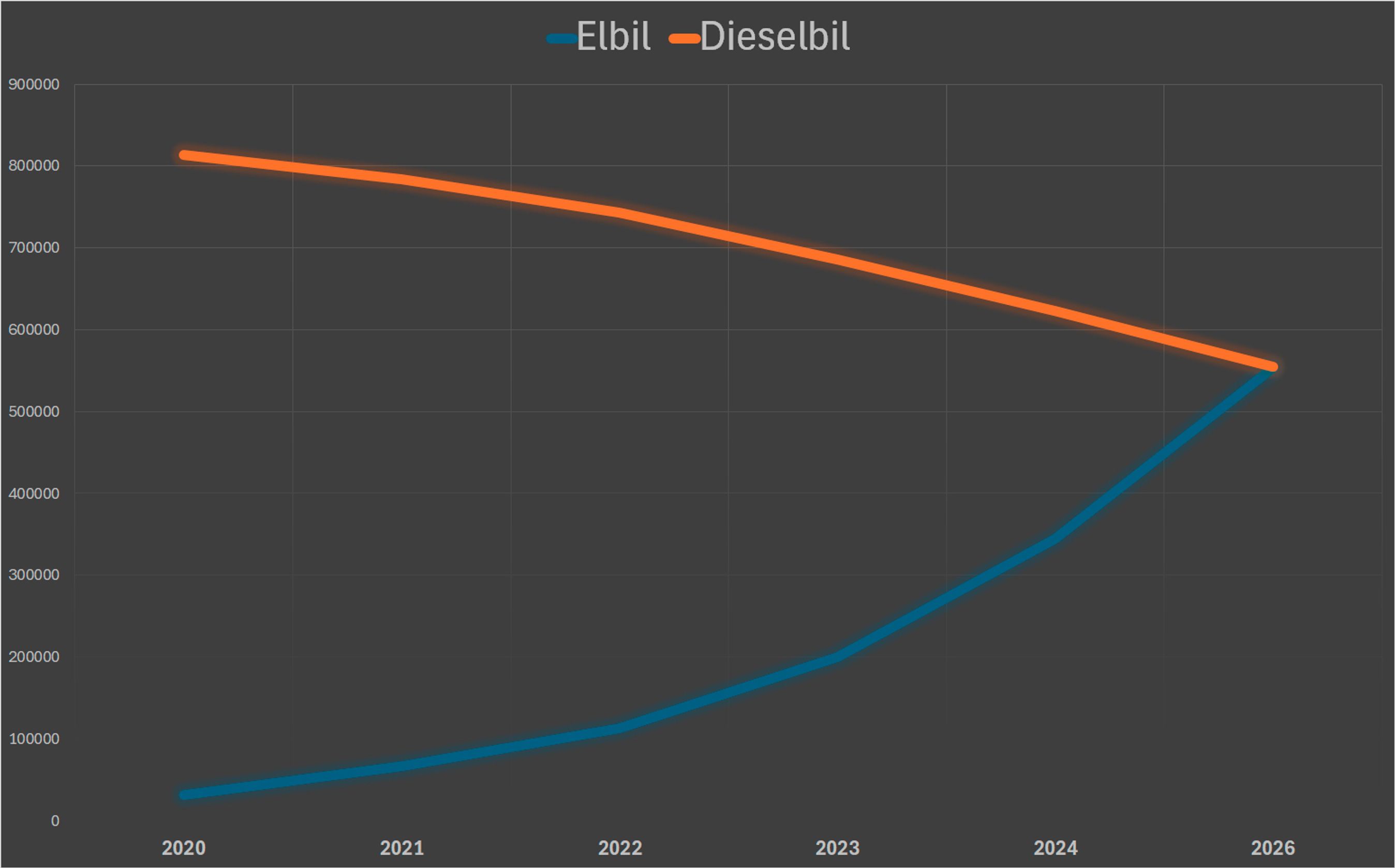 For bare fem år siden var billedet helt anderledes: Da kørte der omkring 812.000 dieselbiler mod blot 32.000 elbiler. Mens elbilerne er gået kraftigt frem især de seneste fire år, er mængden af dieselbiler stille og roligt dalet.