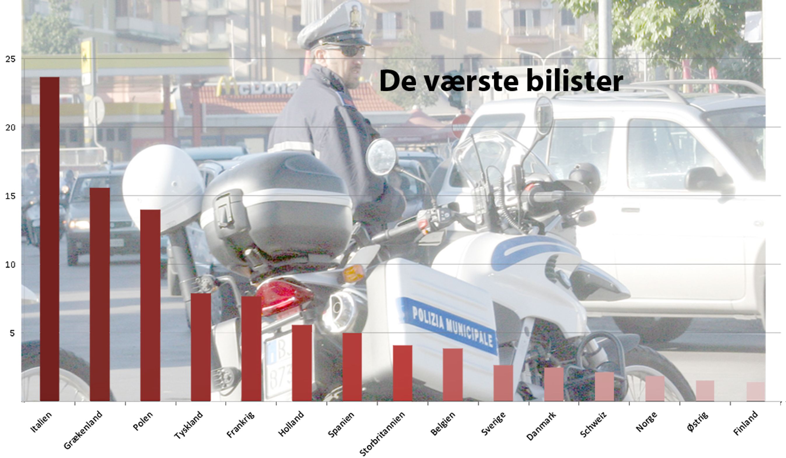 Den hårde bedømmelse af italienere og grækere ser ikke ud til at være en udpræget fordom fra de pæne piger og drenge i Midt- og Nordeuropa, for italienerne selv giver deres landsmænd 28 procent af stemmerne for uanstændig trafikadfærd, mens grækerne er helt oppe på 36 procent og kårer dermed sig selv som de værste bilister i Europa.