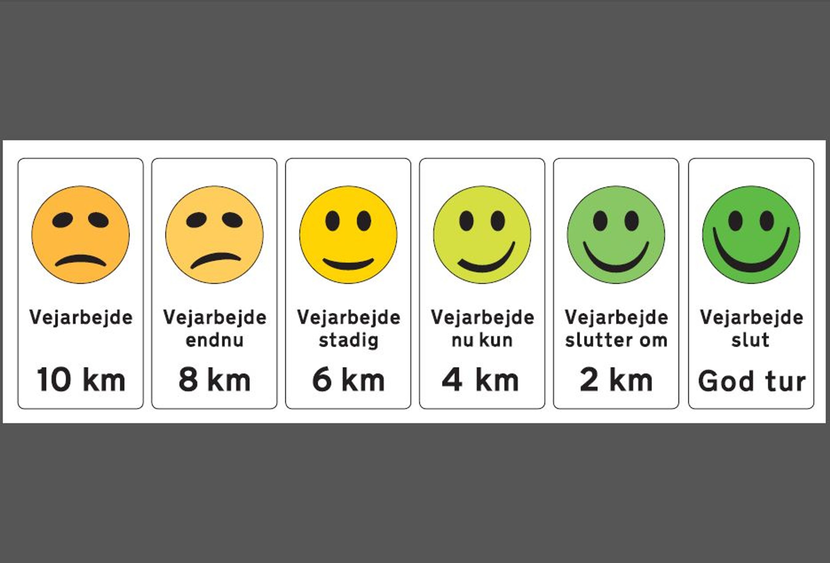 Vejdirektoratet har på Fyn opstillet smiley-skilte, der skal vise trafikanterne, hvor langt der er tilbage på strækningen med vejarbejde.