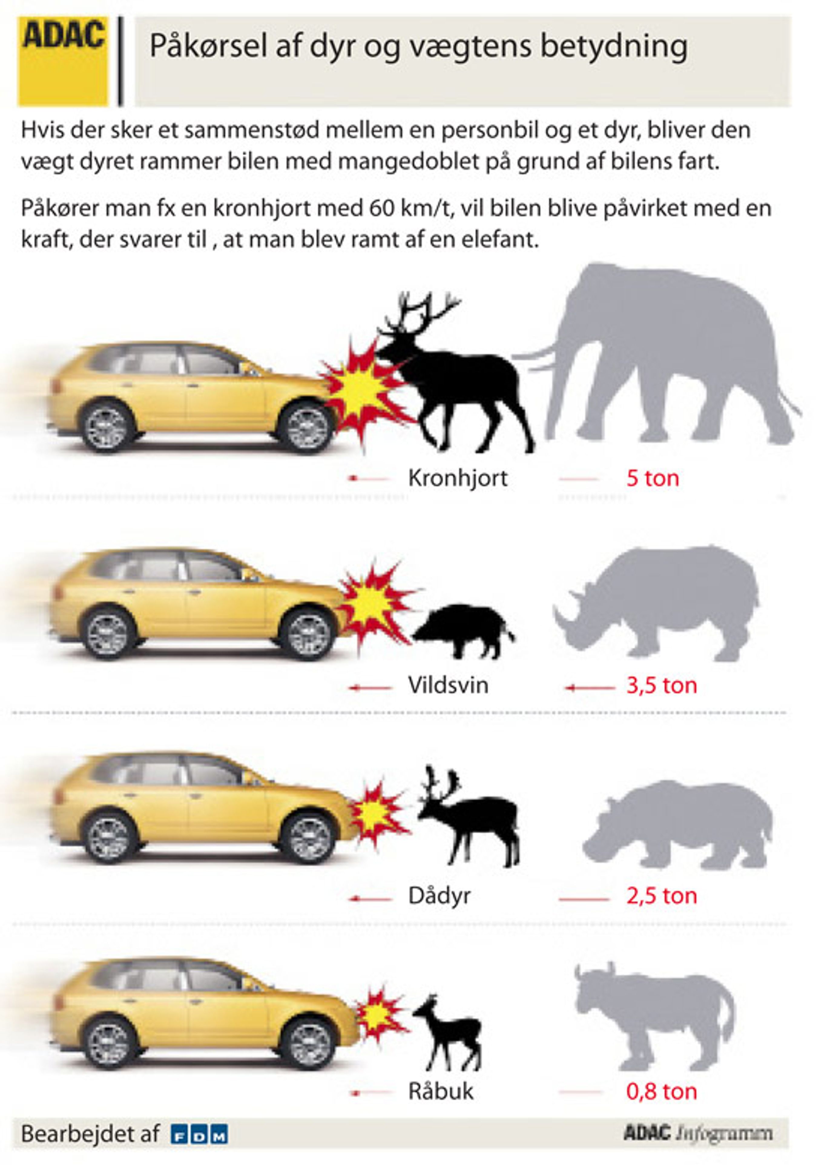 Efteråret kræver ikke kun godt lys på bilen. Det kræver også mere opmærksomhed, når man kører i områder med meget vildt, fx steder hvor der er træer ud til vejene. For det er ikke kun vildtet, der er i fare, hvis det bliver påkørt. Påkører du en kronhjort med 60 km/t, vil bilen blive påvirket med en kraft, der svarer til at bilen bliver ramt af 5 ton, hvilket svarer til vægten af en elefant.