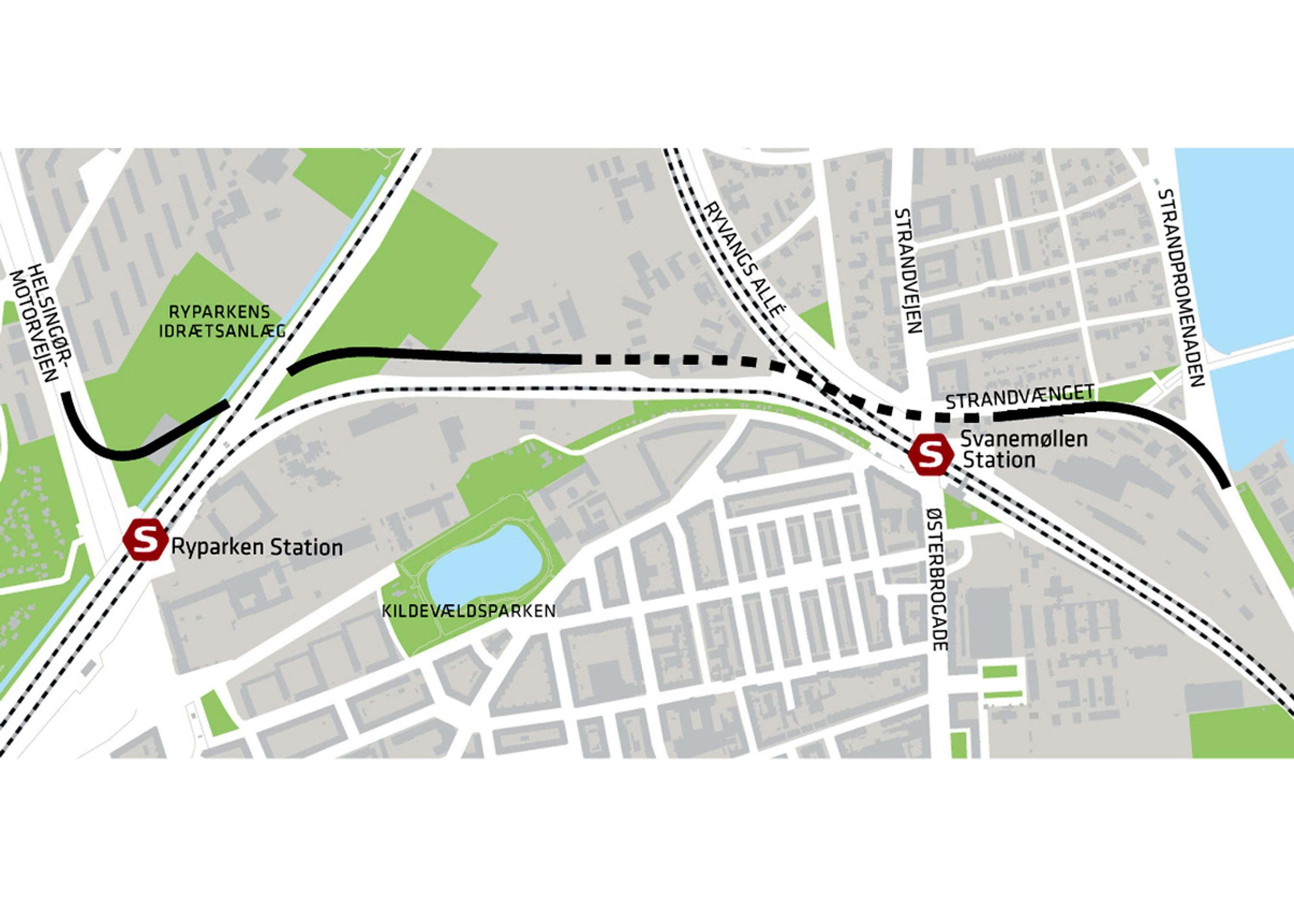 Nordhavnsvej forbinder Helsingørmotorvejen (til venstre) med Nordhavnen/Kalkbrænderihavnsgade. Ca. en tredjedel går i gravet tunnel.