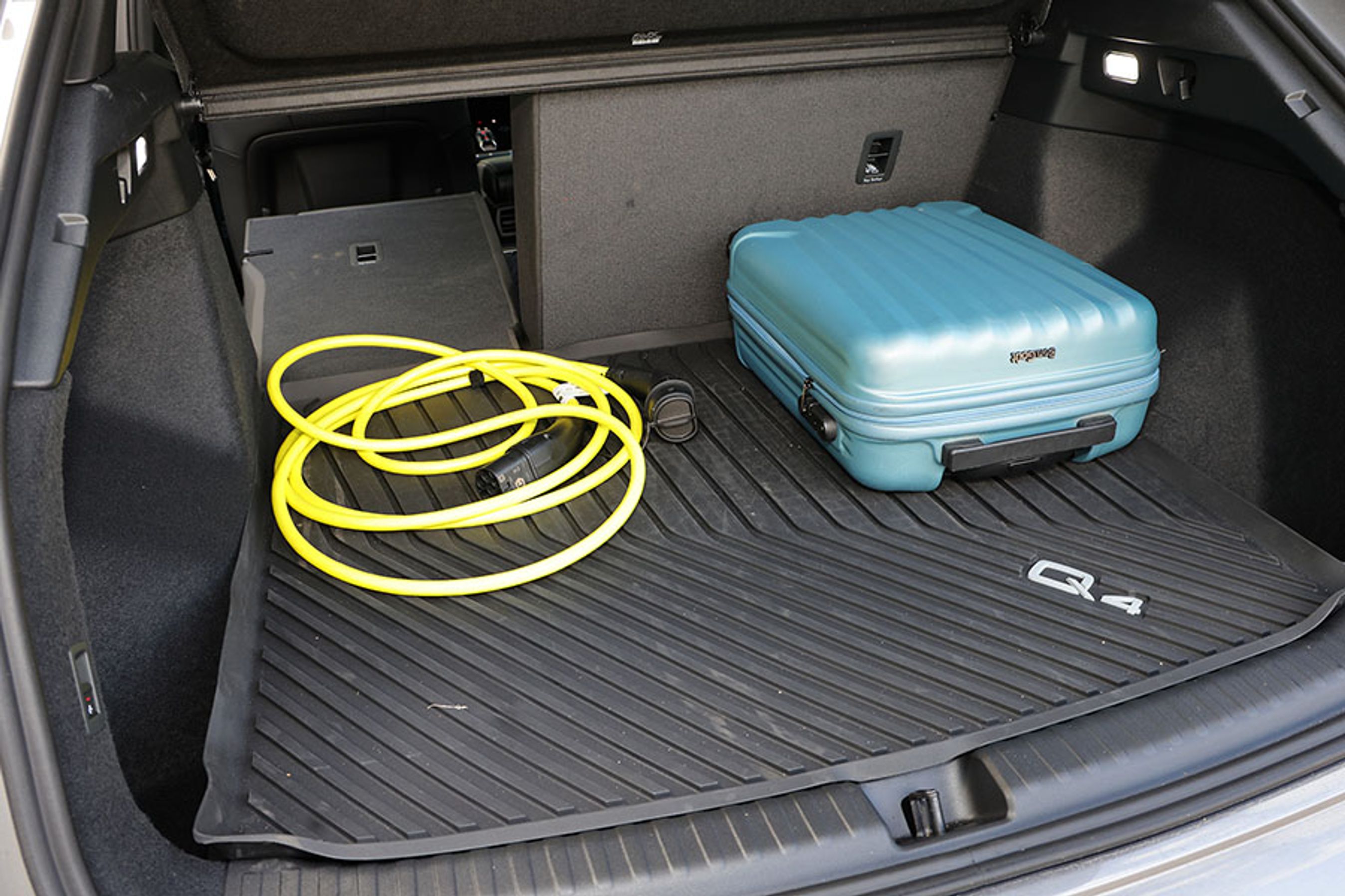 Bagagerummet er også et sted, hvor Audi har prioriteret pladsen mindre end søstermodellerne Skoda Enyaq og VW ID.4. Men der er fortsat 520 liter, hvilket stadig er meget rummeligt. Der er dog ingen frunk, så ladekabler skal ligge i bagagerummet. Her er dog et ekstra rum placeret helt i bunden.