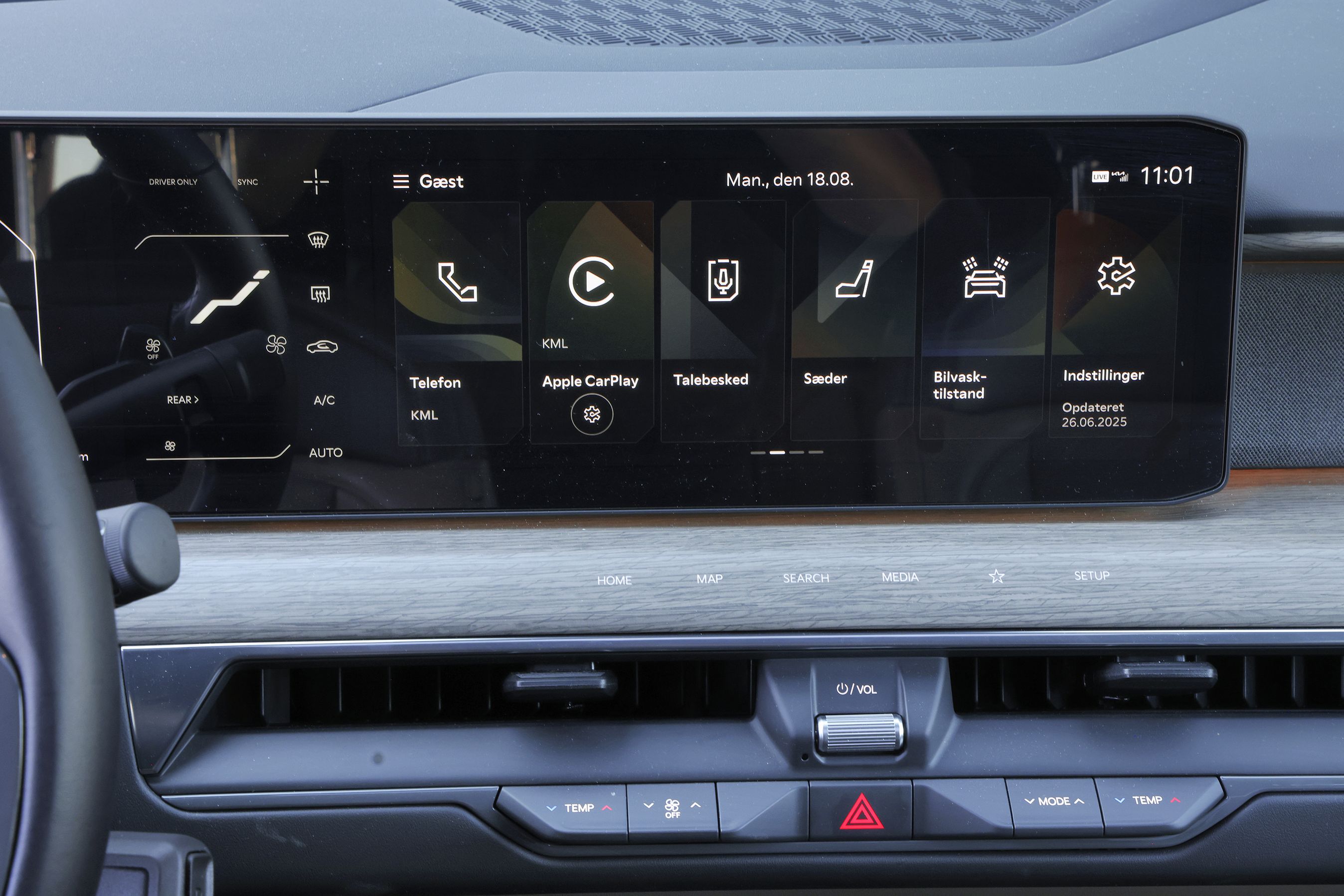 Førerpladsen er formet omkring et stort glaspanel, der indeholder hele tre skærme. De kræver en kort introduktion, men er derefter lette at finde rundt i. Fra rattet styres bade fartpilot og vognbaneassistent. Der er masser af fralægningspladser.