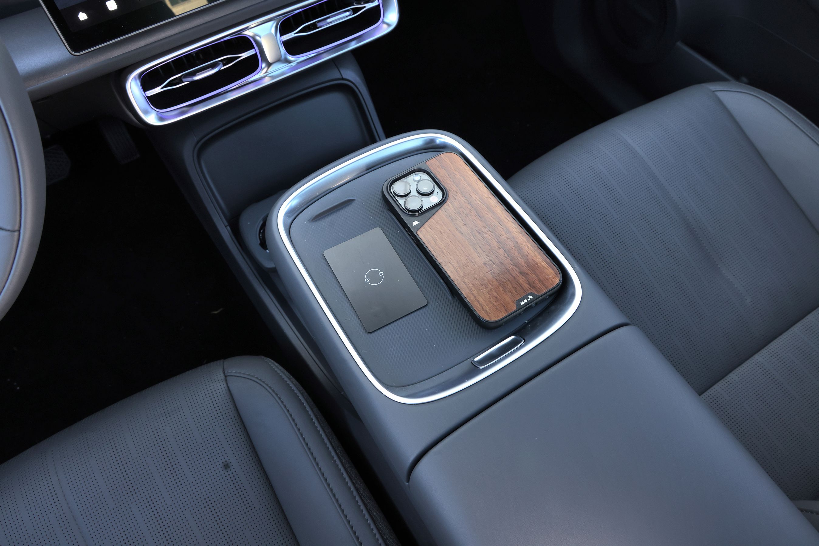 Der er trådløs opladning af mobiltelefonen mellem forsæderne, og det er også her, at nøglekortet skal placeres, hvis man ikke har sat sin mobiltelefon op som adgang til bilen.