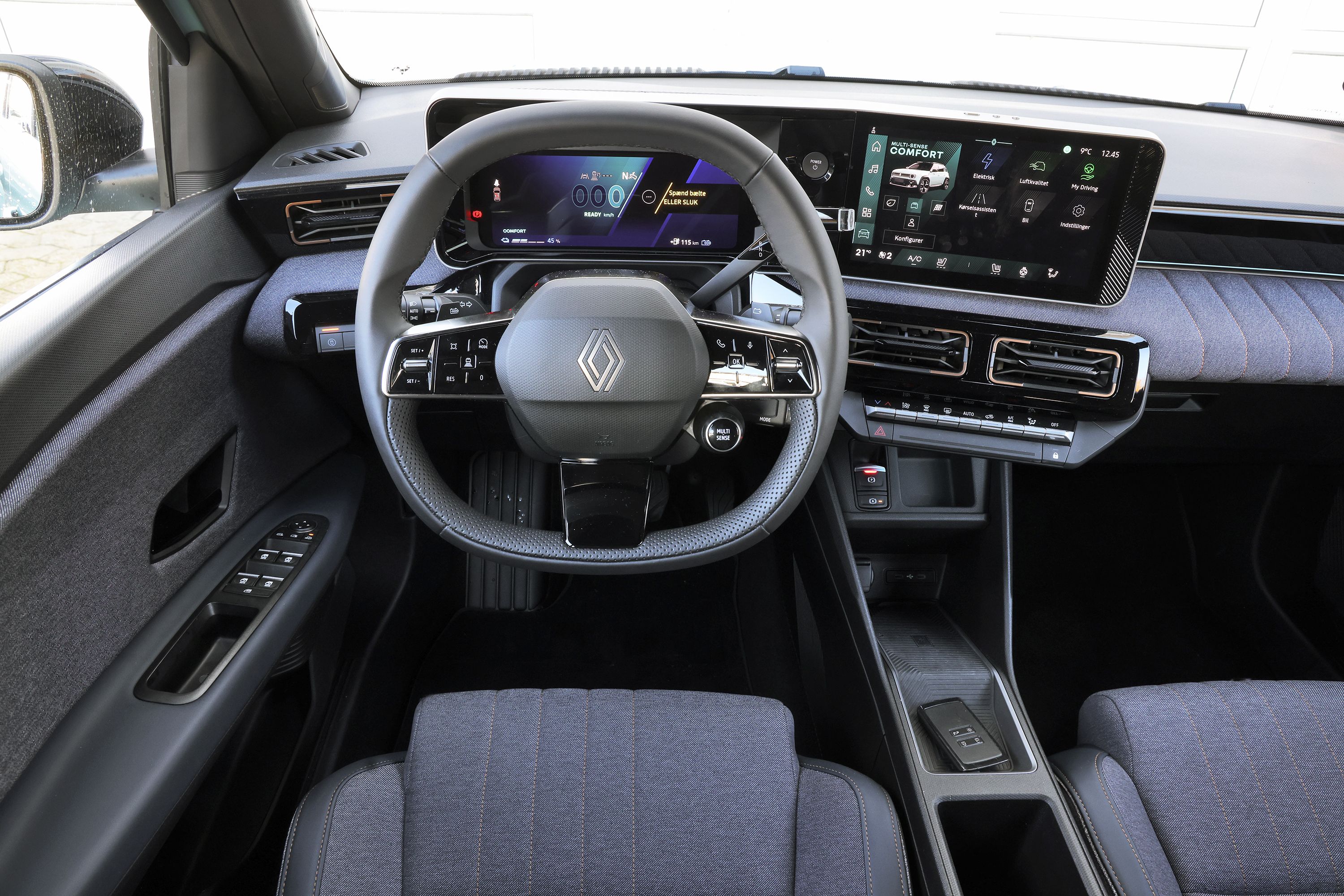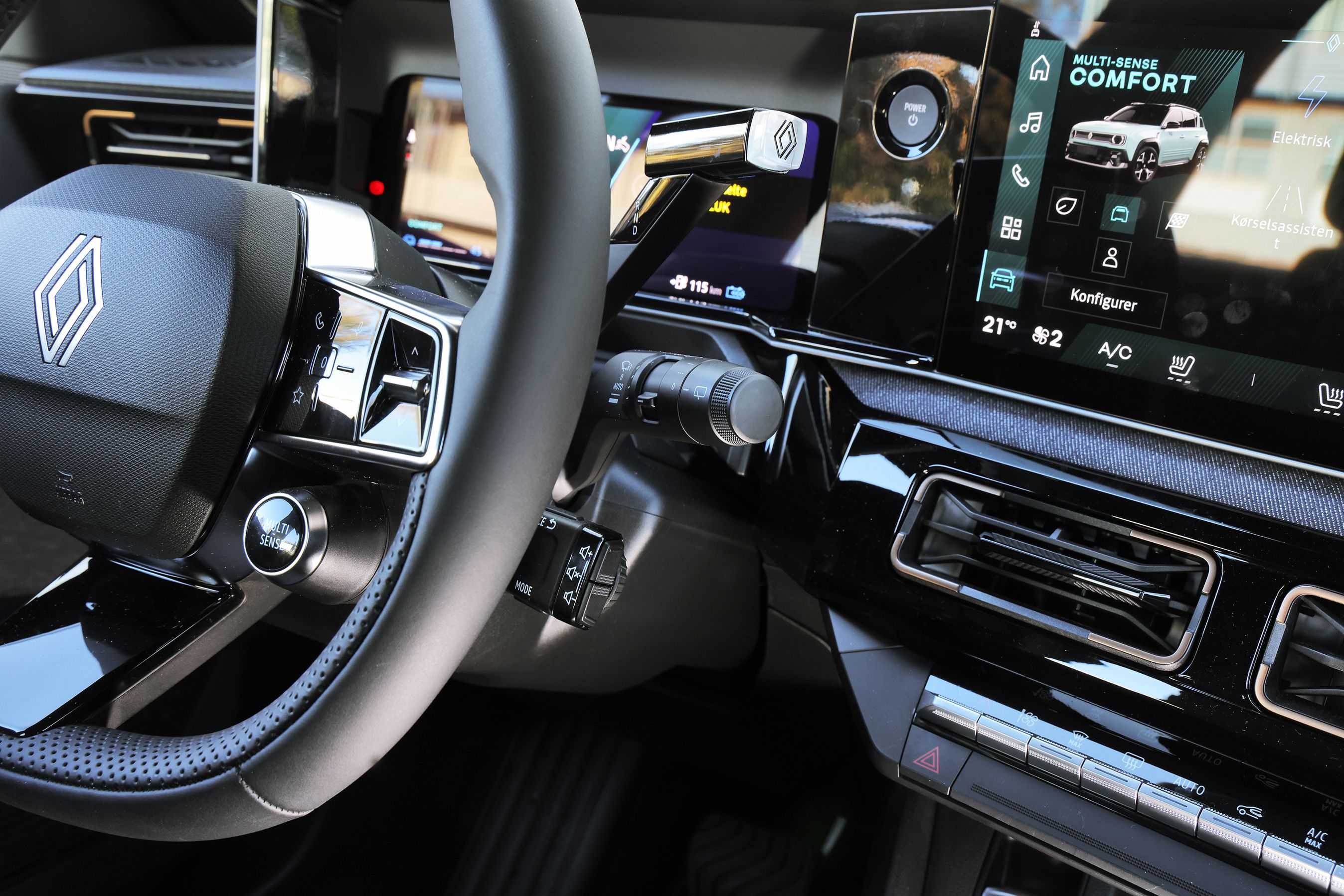 På forsædet er oplevelsen god. Hele indretningen er identisk med Renault 5, men man sidder lidt højere oppe. Så adgangsforholdene er nemmere, og udsynet fra førerpladsen er lidt bedre. Også fordi der er flere ruder i Renault 4. Som i alle Renaults elektriske modeller er der tre stilke til højre for rattet til at betjene gearvælgeren, vinduesviskerne og medieanlægget. Man lærer det efterhånden, men især gearvælger og viskerarm får man til tider byttet rundt på.