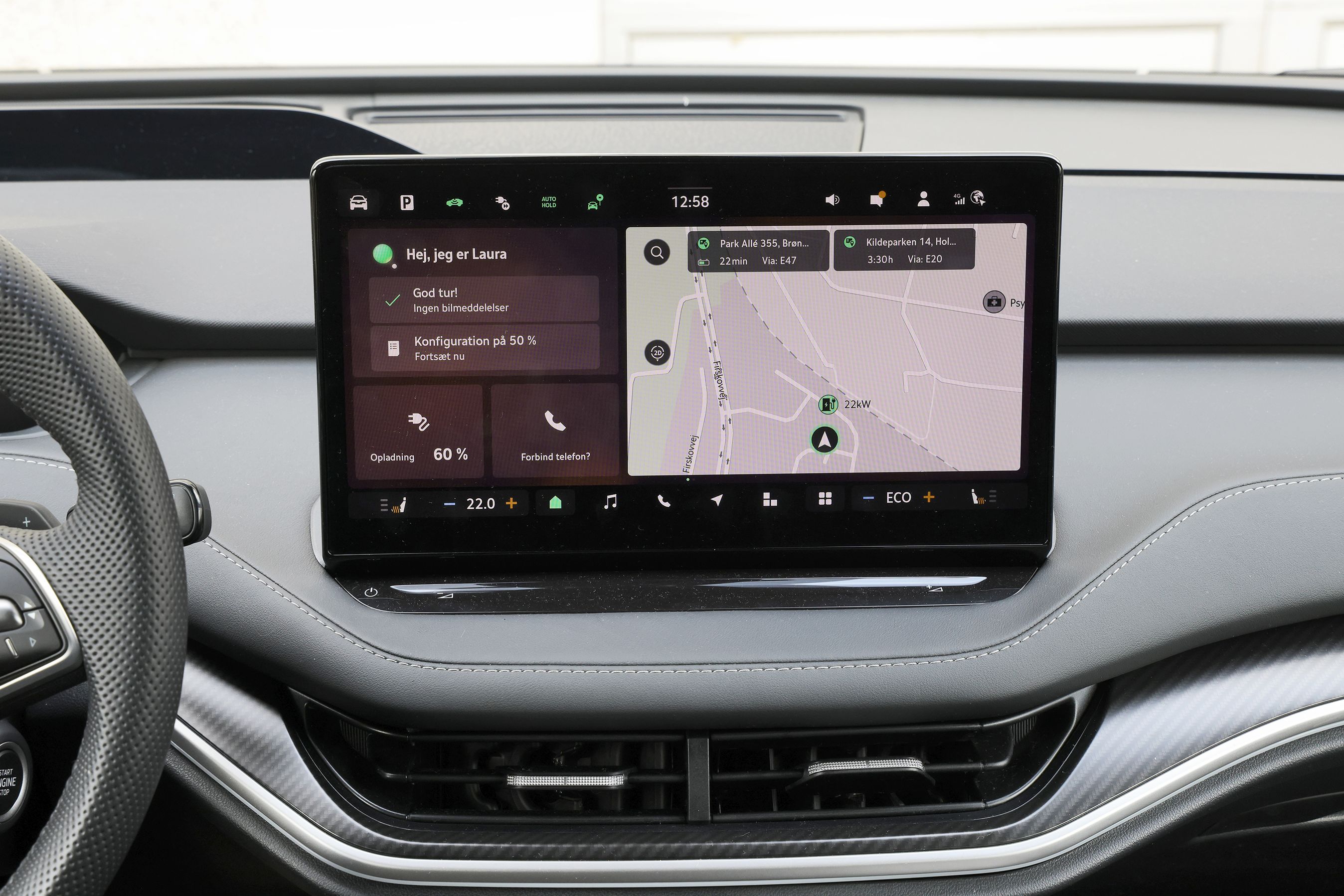 Skærmen i midten er på 13”, og den har faste menulinjer i top og bund, hvor man selv kan vælge indholdet. Den lille grønne bil foroven er f.eks. en genvej til frakobling af advarselslyden ved overskridelse af den hastighedsgrænse, som bilen kender. Man kan tale dansk til den, men den forstår langtfra alt.