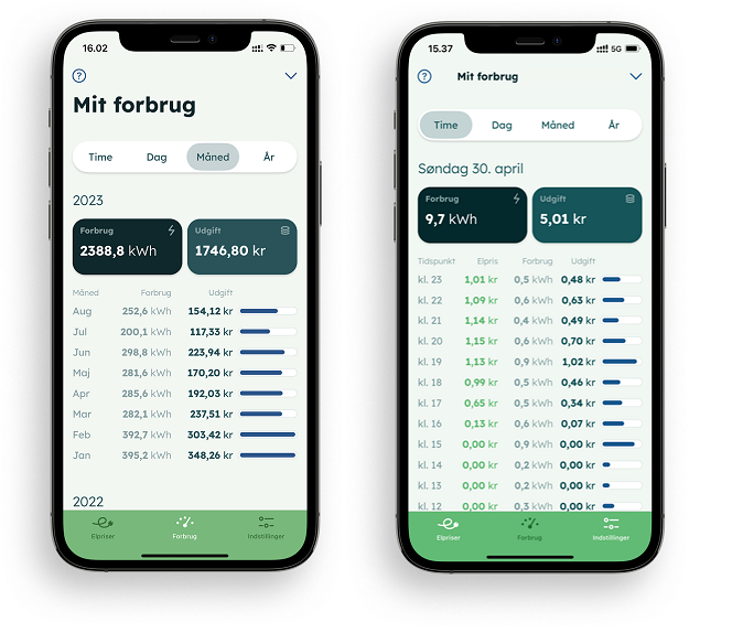 Ello-appen fra Jysk Energi, til iPhone og Android, er et perfekt værktøj til at følge dit elforbrug. Du behøver ikke være kunde med FDM Strøm, men det giver god mening at blive det. Her ser du, hvordan appen præsenterer en månedsvisning og en timevisning.